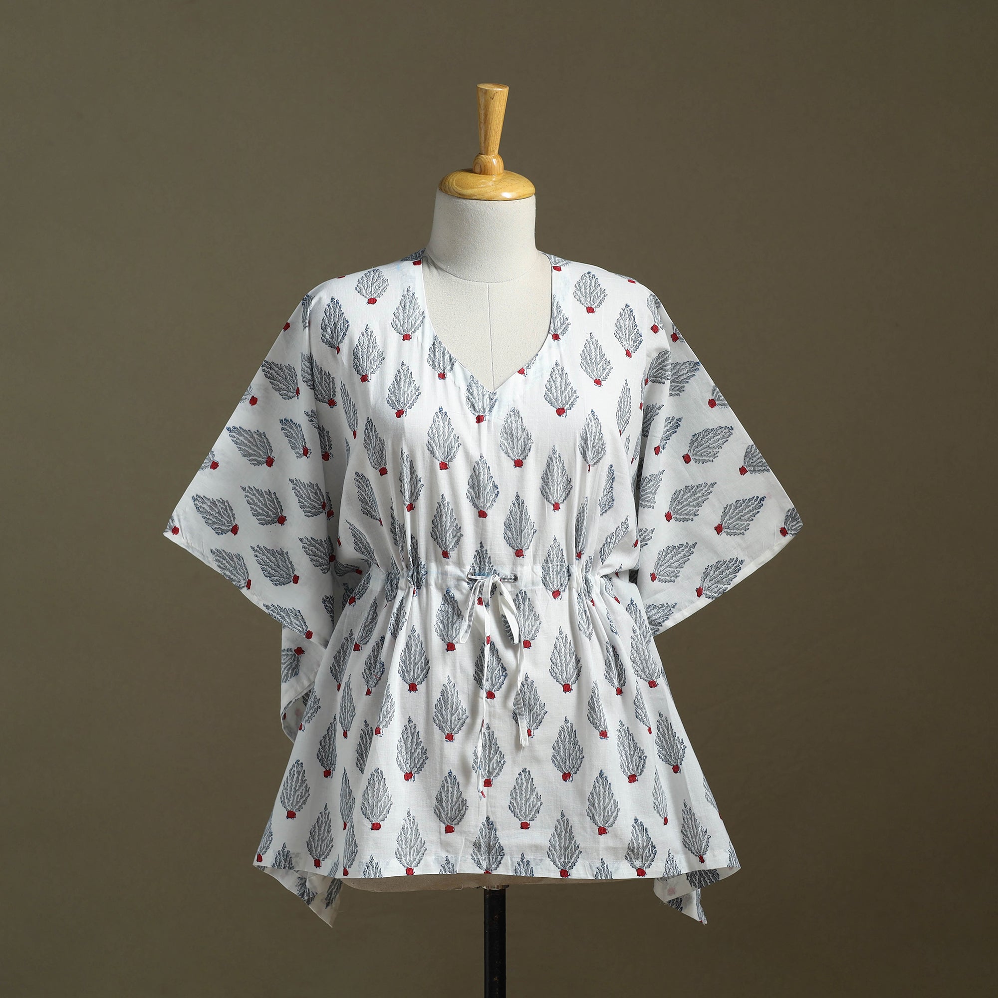 Fine quality sanganeri block printed cotton kaftan with tie-up waist. A traditional kaftan or caftan is an short-length garment with long, flowing sleeves. It has an adjustable drawstring waist. These loose-fitting cotton kaftans are enhanced by a soft touch and beautiful hand prints. This dress will allow you to move with ease and comfort. The drawstring waist tie will give you the freedom to customize the fit to suit your unique shape.