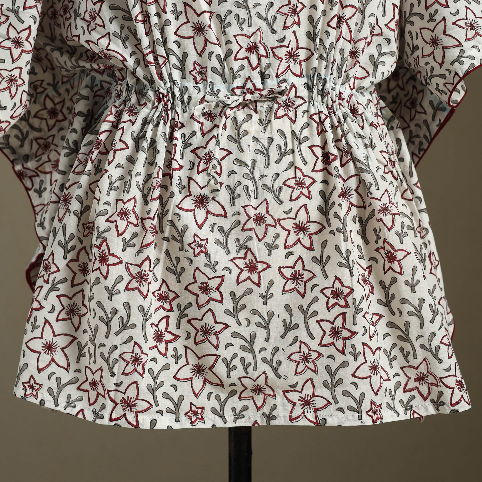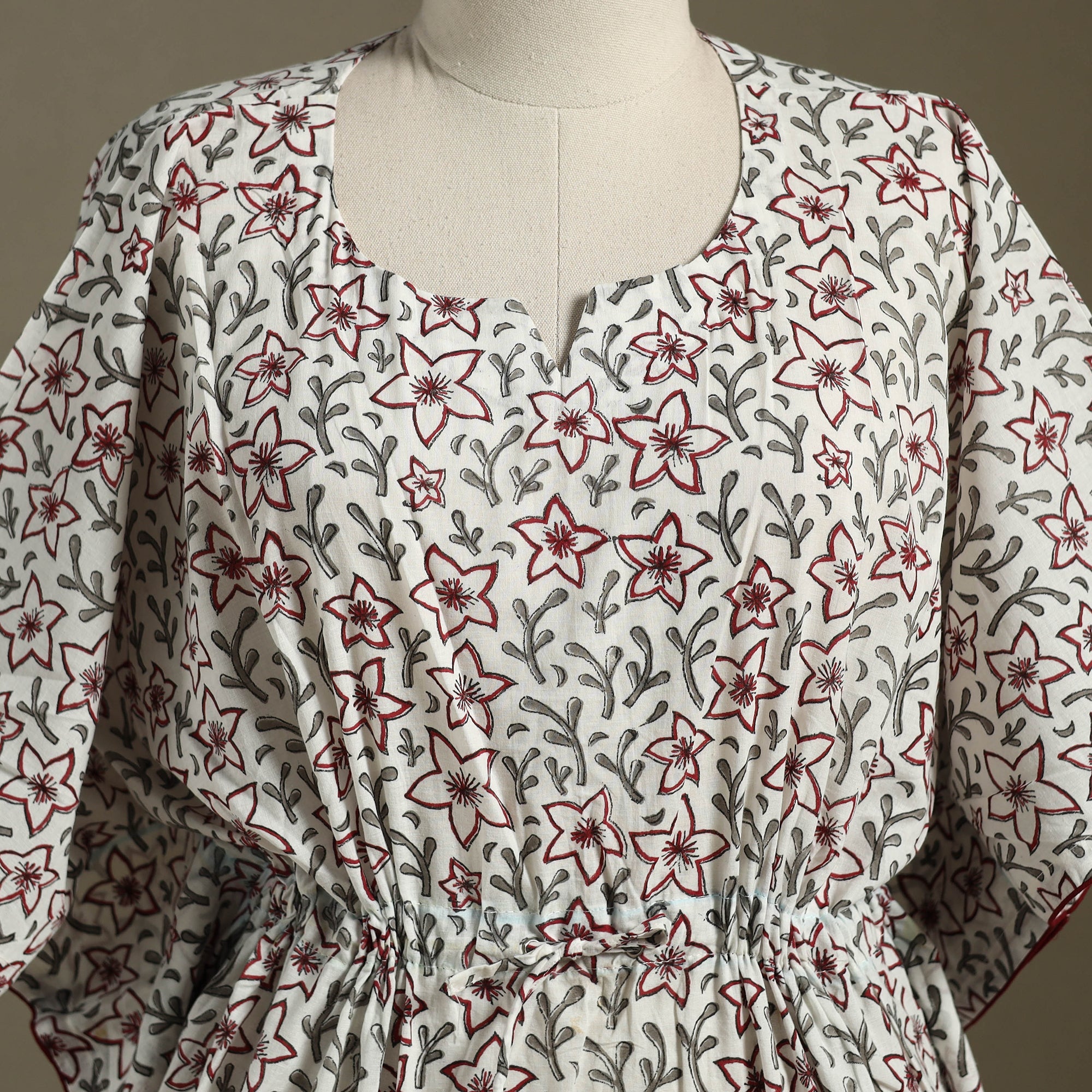 Fine quality sanganeri block printed cotton kaftan with tie-up waist. A traditional kaftan or caftan is an short-length garment with long, flowing sleeves. It has an adjustable drawstring waist. These loose-fitting cotton kaftans are enhanced by a soft touch and beautiful hand prints. This dress will allow you to move with ease and comfort. The drawstring waist tie will give you the freedom to customize the fit to suit your unique shape.