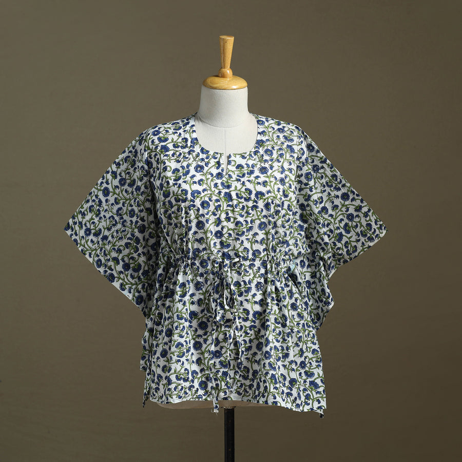Fine quality sanganeri block printed cotton kaftan with tie-up waist. A traditional kaftan or caftan is an short-length garment with long, flowing sleeves. It has an adjustable drawstring waist. These loose-fitting cotton kaftans are enhanced by a soft touch and beautiful hand prints. This dress will allow you to move with ease and comfort. The drawstring waist tie will give you the freedom to customize the fit to suit your unique shape.