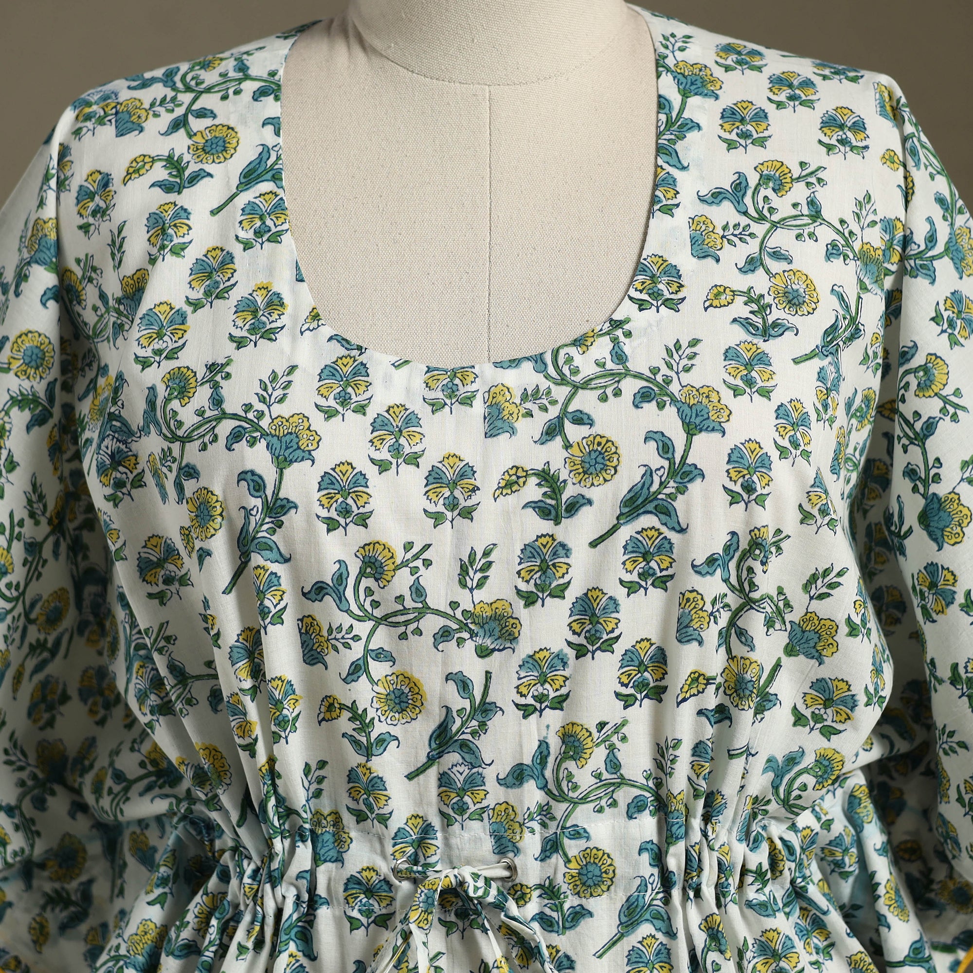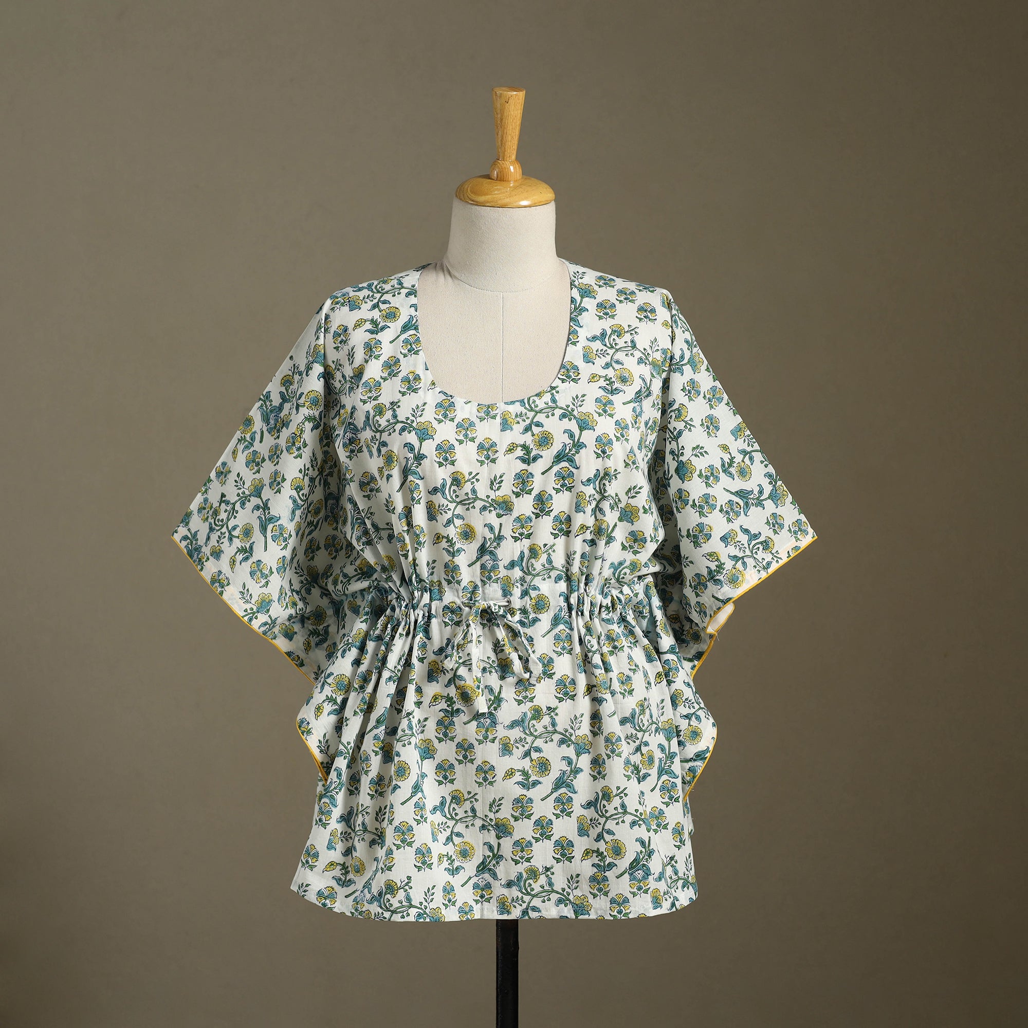 Fine quality sanganeri block printed cotton kaftan with tie-up waist. A traditional kaftan or caftan is an short-length garment with long, flowing sleeves. It has an adjustable drawstring waist. These loose-fitting cotton kaftans are enhanced by a soft touch and beautiful hand prints. This dress will allow you to move with ease and comfort. The drawstring waist tie will give you the freedom to customize the fit to suit your unique shape.