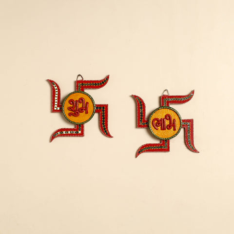 Traditional handpainted wooden shubh labh hanging (set of 2). This shubh labh is studded with beads and stones. It makes your home and pooja room more beautiful and will surely be admired by your guests. |
