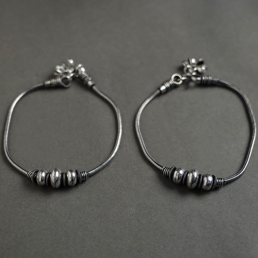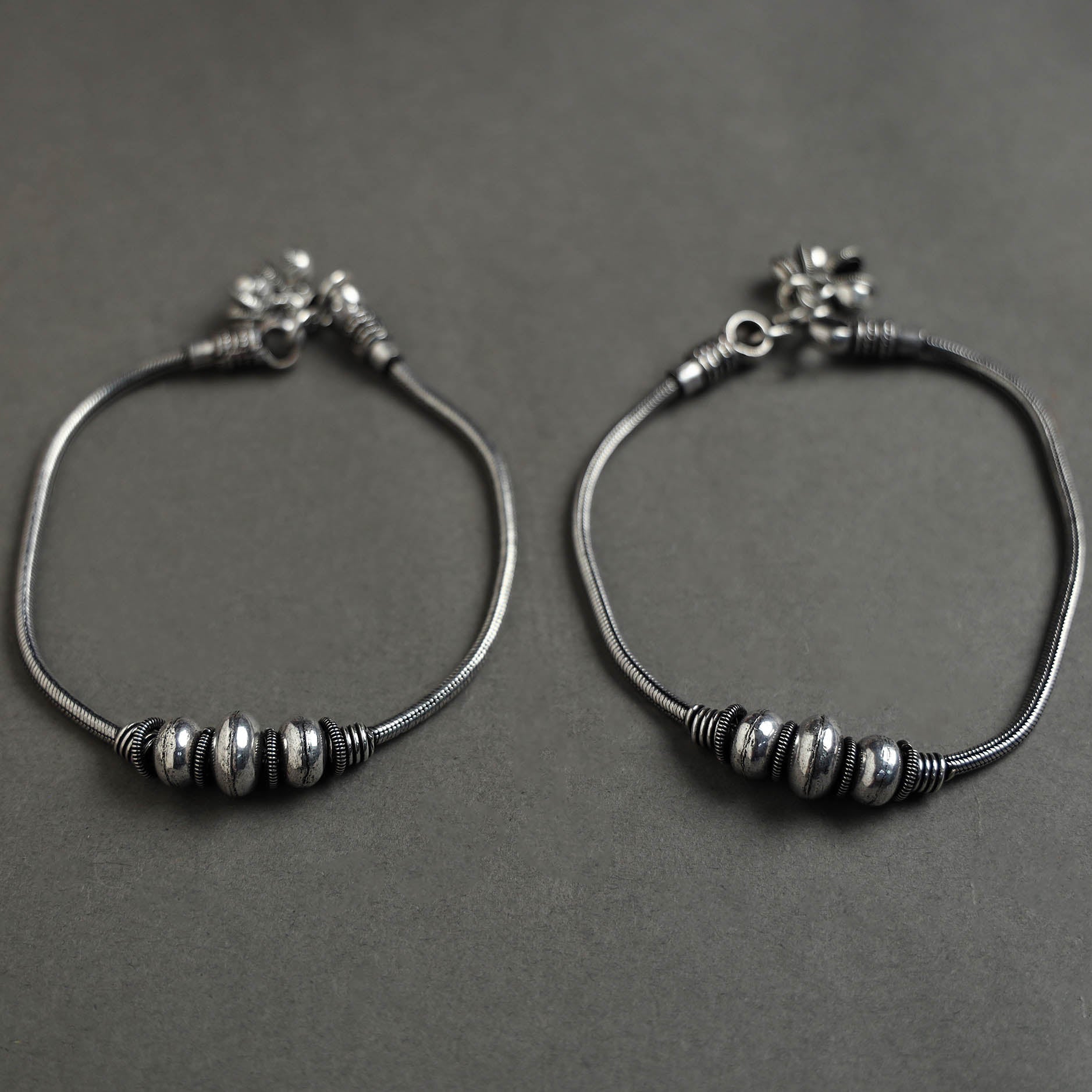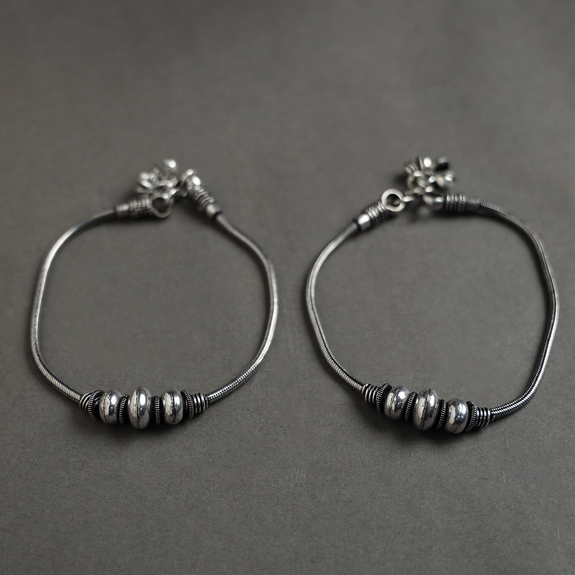 Handcrafted antique-finish anklet pair, made of high-quality oxidised white metal with a rustic shine effect. Perfect for adding a touch of elegance to any outfit, anklet pair's intricate design and vintage charm make it ideal for both casual wear and special occasions.