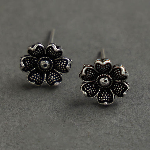 Grey handcrafted antique-finish stud earrings, made of high-quality oxidised white metal with a rustic shine effect. Perfect for adding a touch of elegance to any outfit, stud earrings's intricate design and vintage charm make it ideal for both casual wear and special occasions.