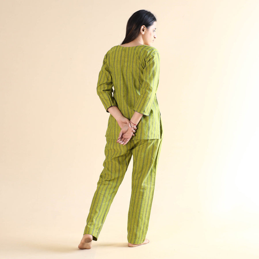 Indulge in comfort with this jacquard cotton top and pyjama night suit set. The cotton fabric ensures a comfortable night's sleep, while the two side pockets offer practical convenience. The night suit will give you the freedom to customsize the fit to suit your unique shape. This night suit is beautiful and skin-friendly, and it allows you to move and sleep with ease and comfort.