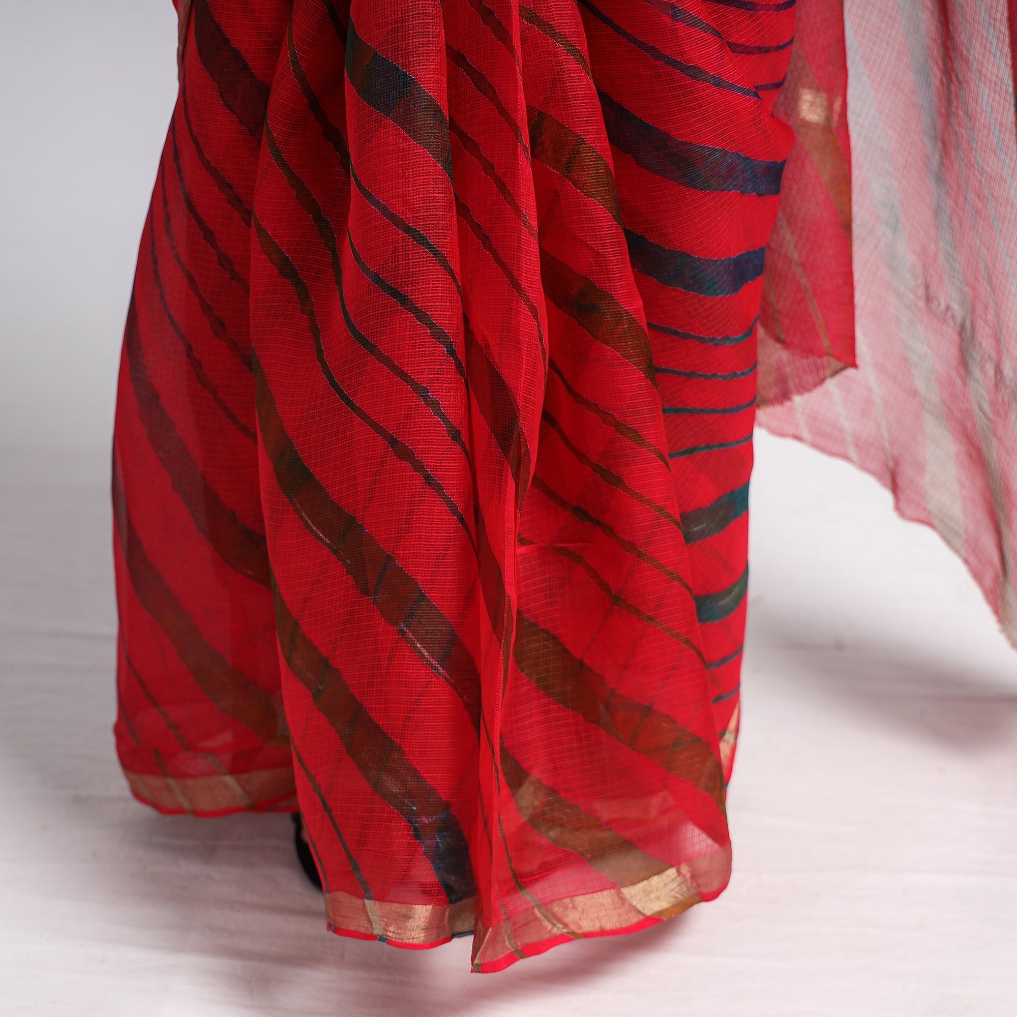 Fine quality red leheriya tie-dye kota doria silk saree, The wavy patterns on this saree has been dyed using leheriya tie & dye technique through traditional process by master artisan family of Badshah Miyan from the state of Rajasthan. Kota doria is a blend of strong cotton and lustrous silk yarns, Kota doria is an age-old Indian textile produced in the Kota district of Rajasthan. The Doria or the threads are finely interweaves to make the check patterns. Its lightweight and sheer texture giving an exquisite grace and elegance of its own.
