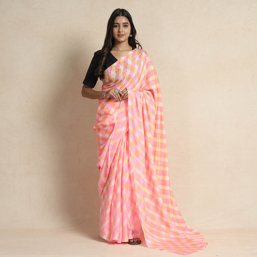 Fine quality original pink leheriya tie-dye mulberry silk handloom saree. The wavy patterns on this saree has been dyed using leheriya tie & dye technique through traditional process by master artisan family of Badshah Miyan from the state of Rajasthan. Mulberry silk known for its shine and softness. It is one of the most renowned and popular forms of Silk, particularly when it comes to textiles.