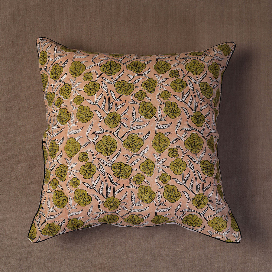 Fine quality peach sanganeri block printed cotton cushion cover. Sanganeri is a hand-block printing technique originating from Sanganer, a village in the southern part of Jaipur, Rajasthan. Bleed free VAT dyes used. Spruce up your living room decor using this sanganeri cushion cover.