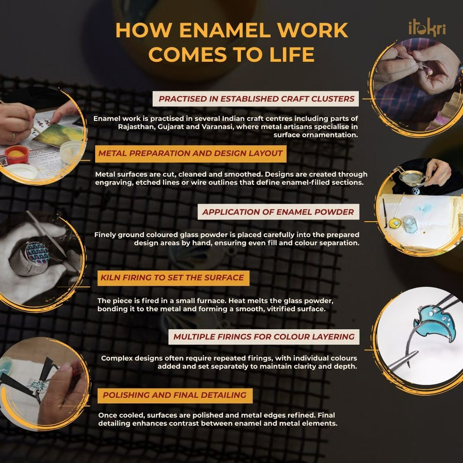 Enamel crafts are decorative techniques that apply glass glaze to metal objects and surfaces that melt on the surface with intense heat, creating a brightly colored decorative effect.