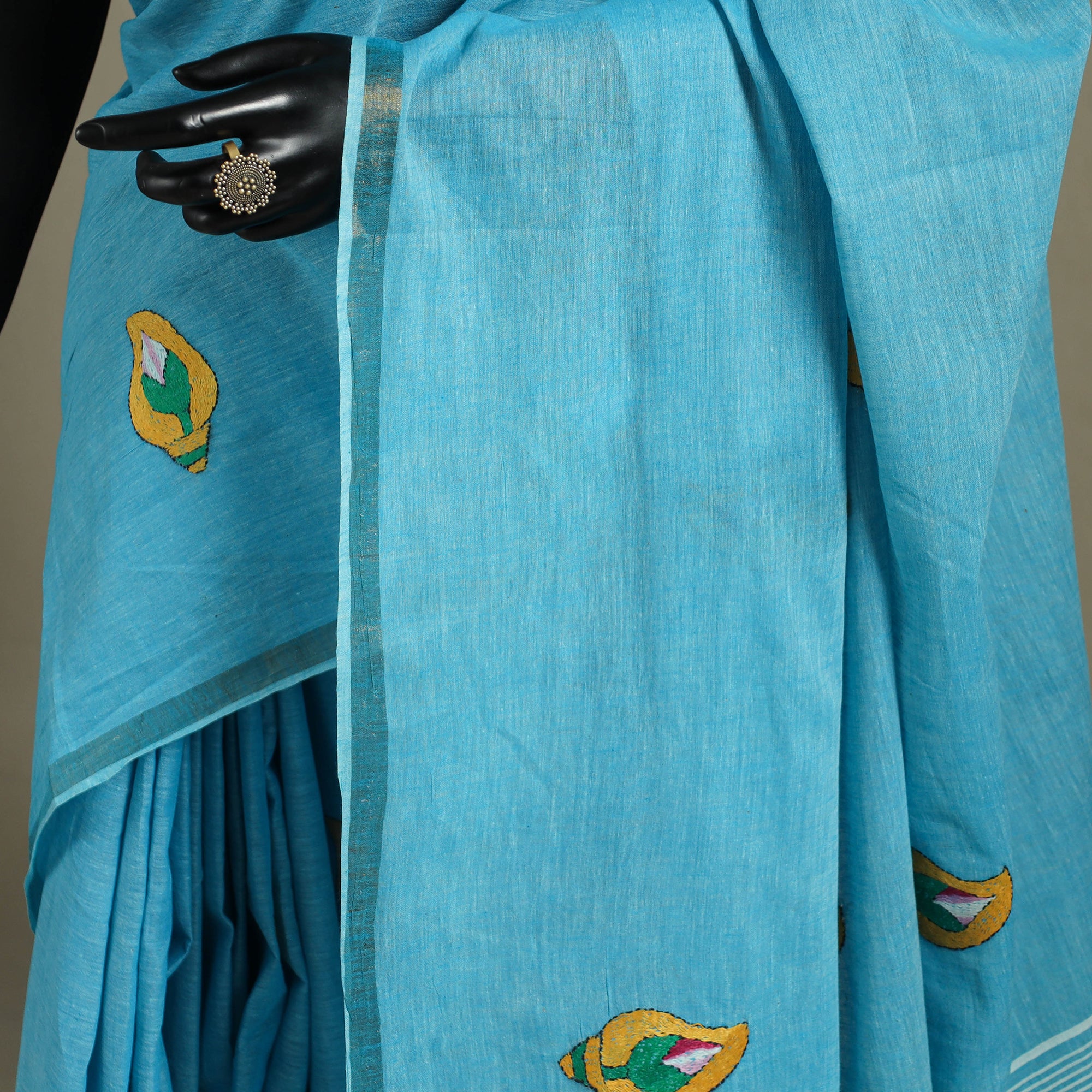 Fine quality blue handloom kantha work pure cotton saree from Bengal. Designed with contemporary patterns & has been hand embroidered using West Bengal's traditional craft technique of Kantha.