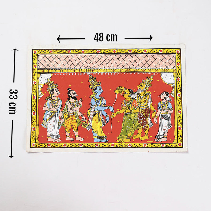 Traditional handpainted cheriyal folk art painting done on canvas cloth base, made using water colours. The Cheriyal paintings are a unique pictorial presentation of the numerous tales from Hindu epics like the Mahabharata and Ramayana, and the various Indian Puranas. The scrolls also depict the legends and mythologies of the communities along with their gods and heroes. Irrespective of the community or profession, each Cheriyal scroll starts with a panel of Ganapati, the God of wealth, followed by Sarswati, the Goddess of learning. It is customary for the artist to seek the blessing of the deities in order to ensure that the art flourishes without any obstacles.