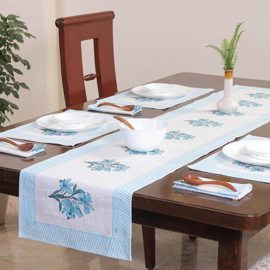Blue sanganeri block printing cotton table runner, table mat & napkin set. Sanganeri is a hand-block printing technique originating from Sanganer, a village in the southern part of Jaipur, Rajasthan. Bleed free VAT dyes used.