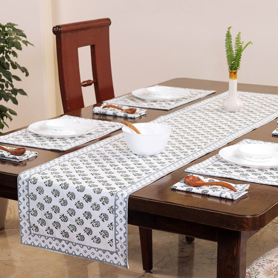 White Sanganeri block printing cotton table runner, table mat & napkin set. Sanganeri is a hand-block printing technique originating from Sanganer, a village in the southern part of Jaipur, Rajasthan. Bleed free VAT dyes used.