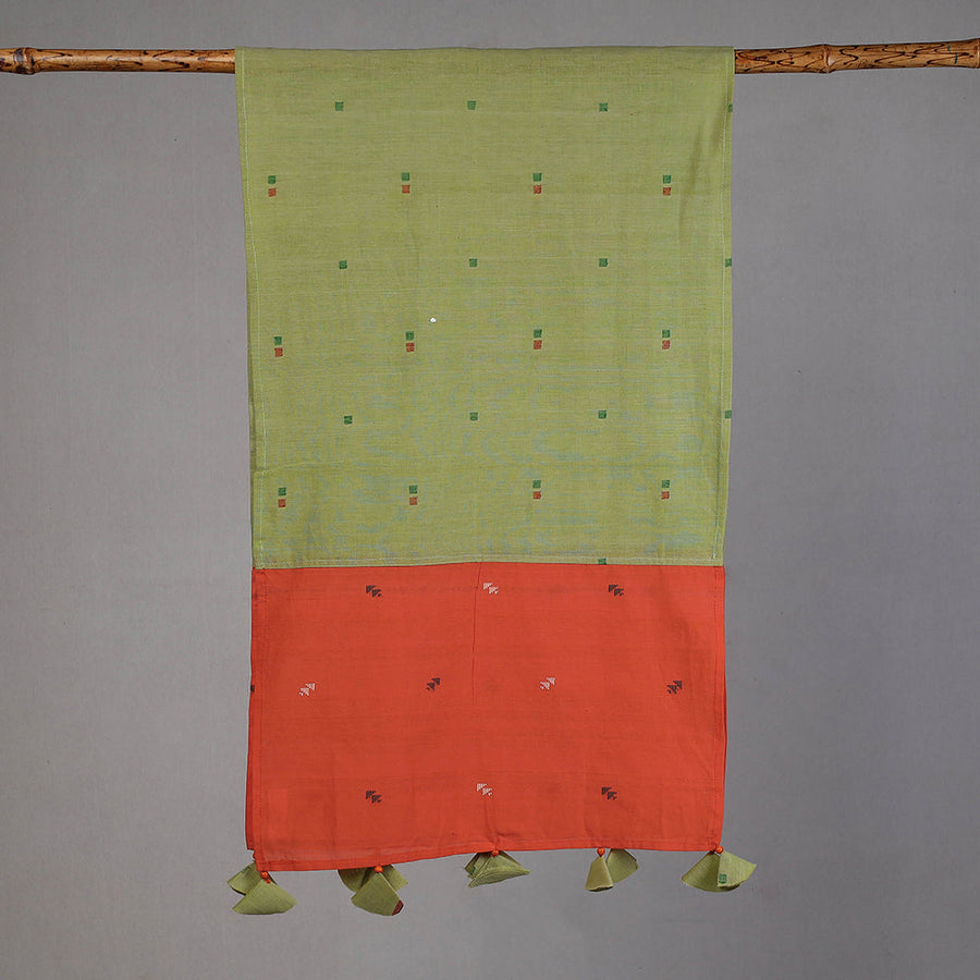 Fine quality orange godavari jamdani buti handloom patchwork cotton stole with tassels from Andhra Pradesh. The base fabric for Jamdani is unbleached cotton yarn and the design is woven using bleached cotton yarns so that a light-and-dark effect is created. The process is extremely time consuming as it involves a tedious form of hand looming. The making of Jamdani involves the supplementary weft technique along with the standard weft technique. With the latter, the base sheer material is made on which thicker threads on used to create designs.