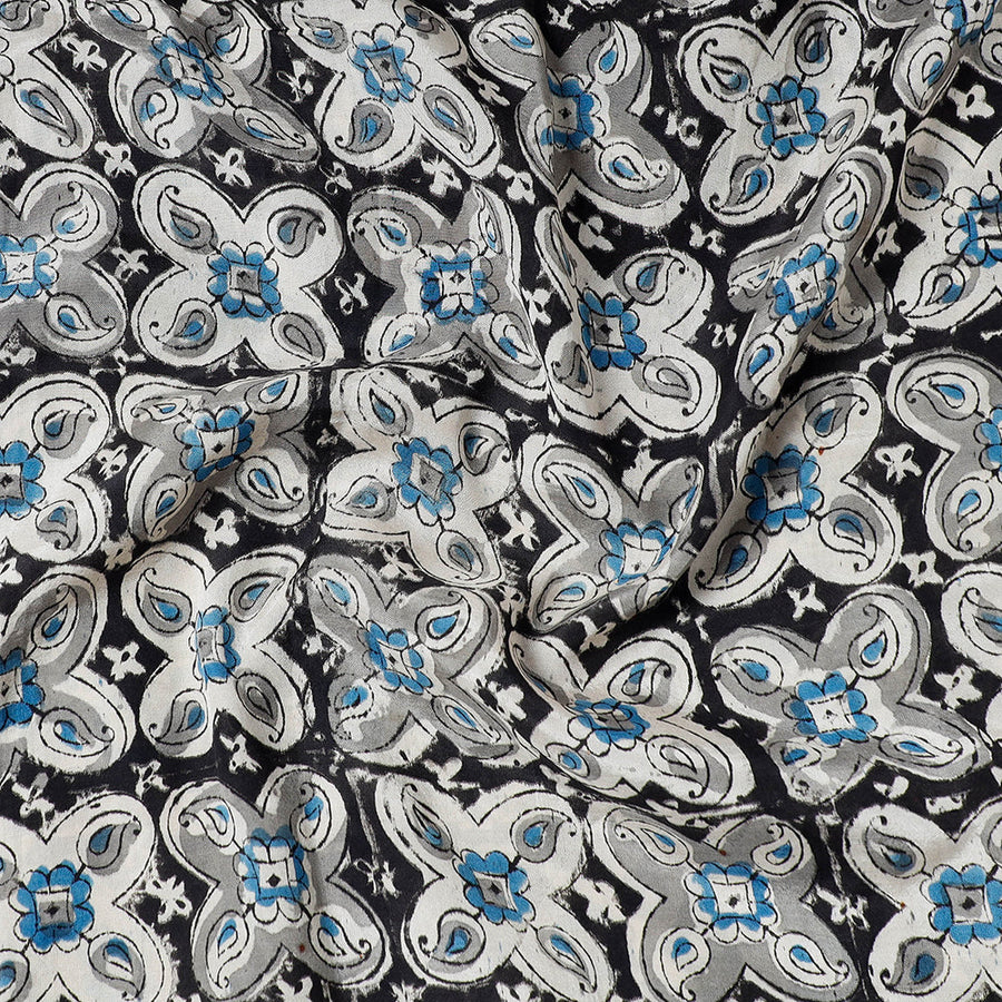 Fine quality black handpainted srikalahasti kalamkari pen work chanderi silk precut fabric. Chanderi silks are known for its gossamer looks and amazing feel. This exquisite fabric is created with Srikalahasti style of kalamkari, wherein the "kalam" or pen is used for free hand drawing of the subject and filling in the colours. It is entirely hand worked using natural colours. Kalamkari in Srikalahasti has been around for 200 years approximately. Unlike other places where this particular craft is practiced, artists in Srikalahasti retains the ancient techniques of dyeing which have been passed down from generations. As it is hand-painted/handcrafted, colour spread and irregularity in design is common, hence it won't be considered as damaged or defective.
