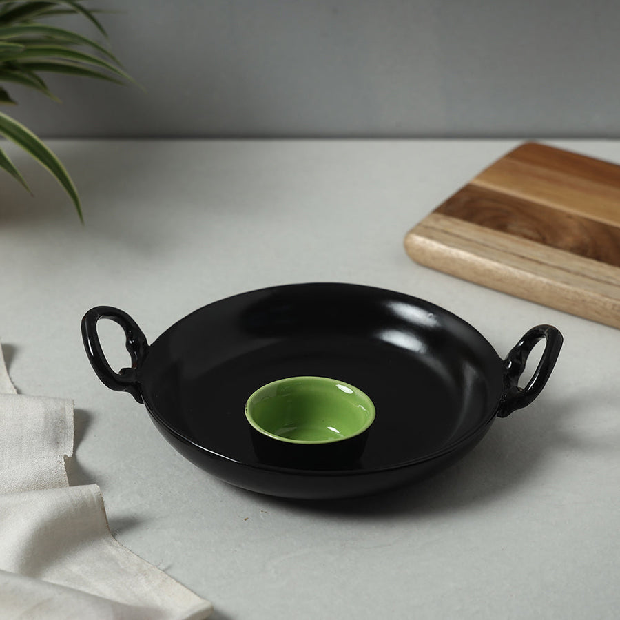 Handmade black ceramic chip-n-dip platter tray. The art and the way of serving just got a whiff of our elegant past. Behold the intricately designed, and subtly appealing ceramic platters, for your serving needs and adding a new zing to the table. This brilliant white matt finish pottery snack tray and dip/chutney bowl combo is a must for every home and features a timeless. The platter comes with an attached bowl, which furthers the practical design, making it convenient for everyday use, and to attend to the guests. Microwave safe and Lead free. Sturdy and built to last for everyday use.