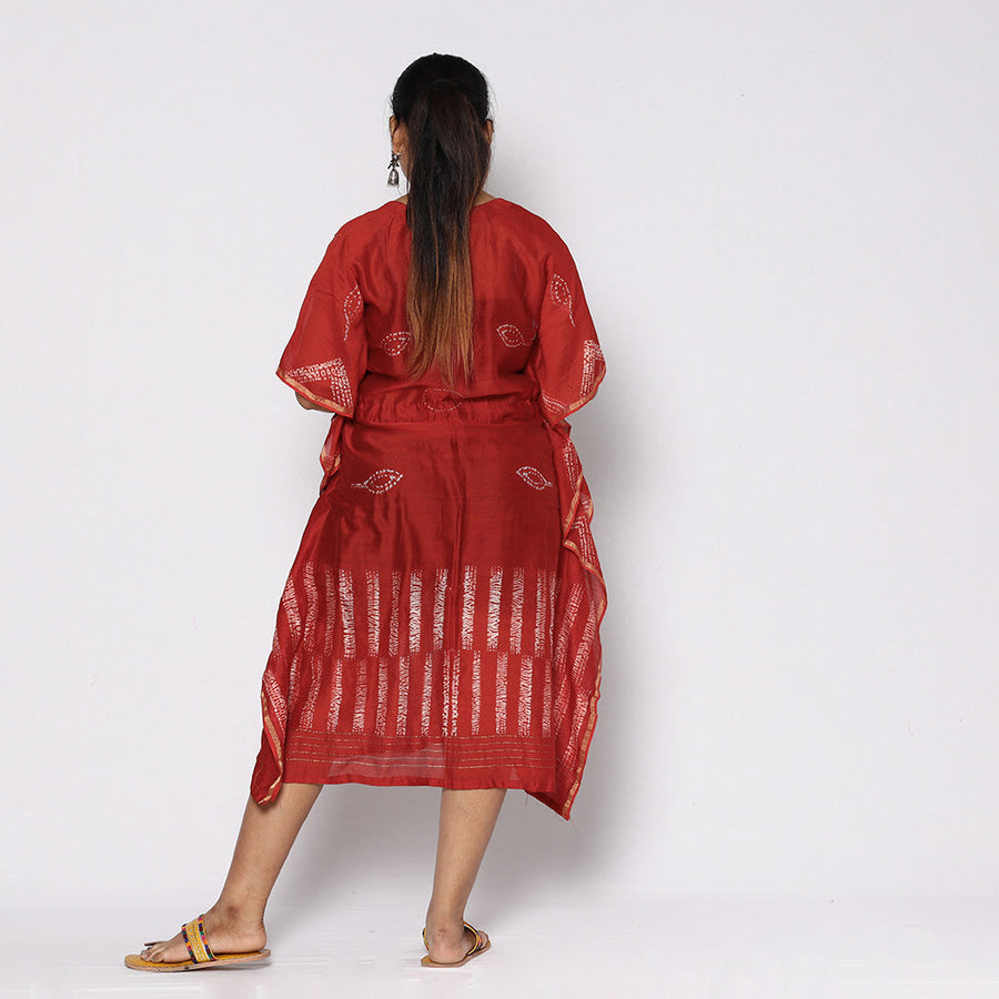 Fine quality shibori tie-dye chanderi silk kaftan with tie-up waist. A traditional kaftan, or caftan, is a knee-length garment with long, flowing sleeves. It has an adjustable drawstring waist. These loose-fitting chanderi silk kaftans are enhanced by a soft touch and beautiful tie-dye patterns. This dress will allow you to move with ease and comfort. The drawstring waist tie will give you the freedom to customise the fit to suit your unique shape. Chanderi silks are known for their gossamer looks and amazing feel.