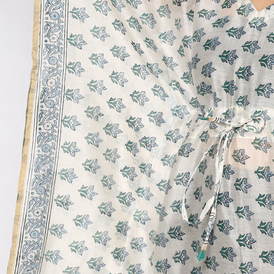 Fine quality sanganeri block printed chanderi silk kaftan with tie-up waist. A traditional kaftan, or caftan, is a knee-length garment with long, flowing sleeves. It has an adjustable drawstring waist. These loose-fitting chanderi silk kaftans are enhanced by a soft touch and beautiful block-printed patterns. This dress will allow you to move with ease and comfort. The drawstring waist tie will give you the freedom to customise the fit to suit your unique shape. Chanderi silks are known for their gossamer looks and amazing feel.