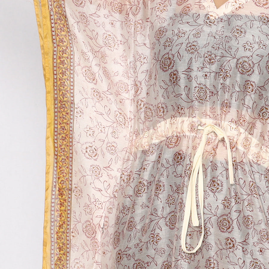 Fine quality sanganeri block printed chanderi silk kaftan with tie-up waist. A traditional kaftan, or caftan, is a knee-length garment with long, flowing sleeves. It has an adjustable drawstring waist. These loose-fitting chanderi silk kaftans are enhanced by a soft touch and beautiful block-printed patterns. This dress will allow you to move with ease and comfort. The drawstring waist tie will give you the freedom to customise the fit to suit your unique shape. Chanderi silks are known for their gossamer looks and amazing feel.