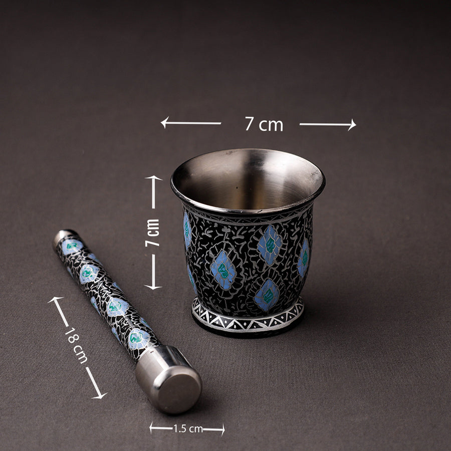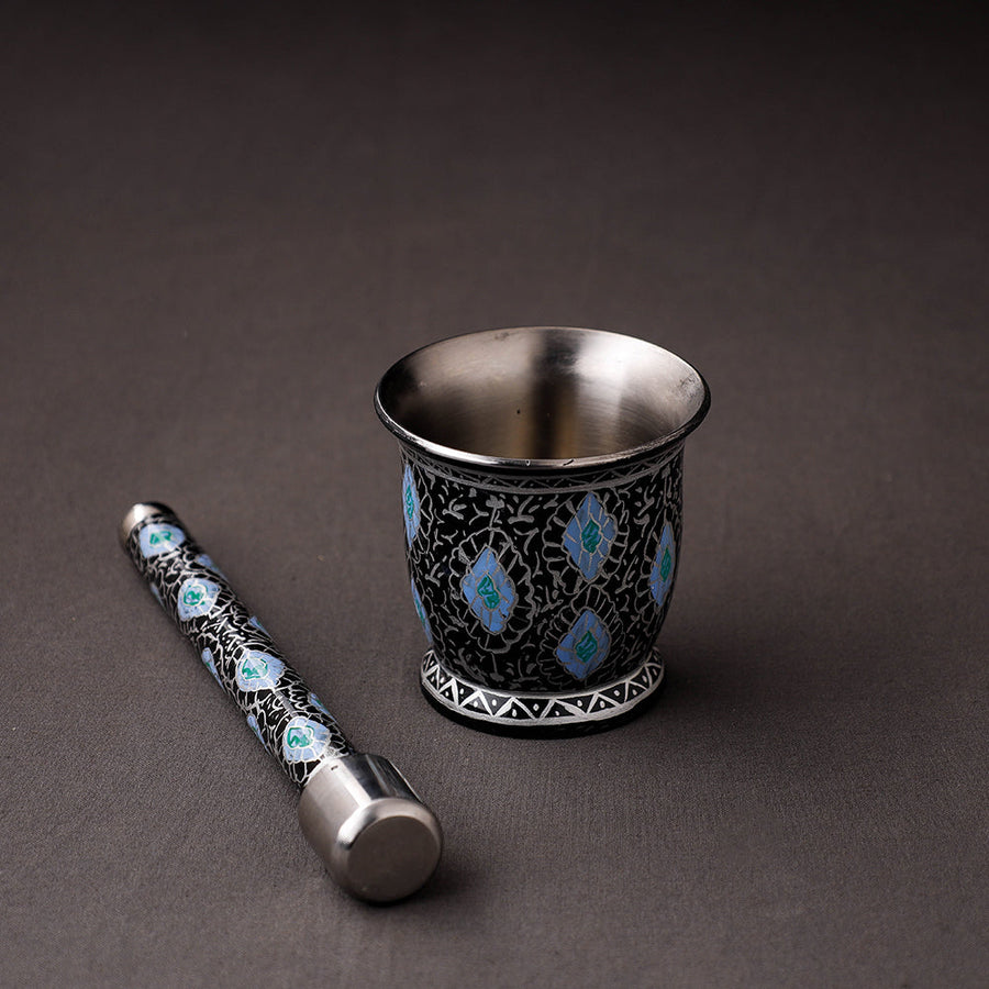 | Material | Floral design black handpainted mortar and pestle with waterproof oil based paint on very high quality stainless steel by the artisans of Kashmir. |