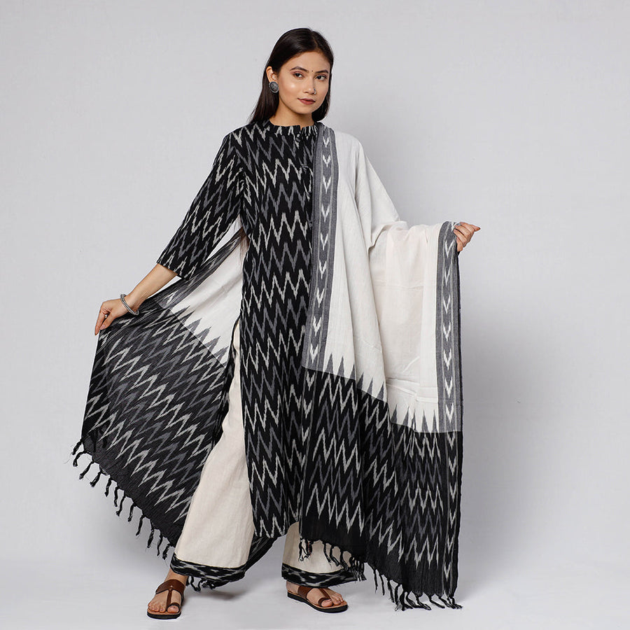 Elevate your style with this exquisite pochampally ikat cotton suit set. Featuring a uniquely designed long kurta with side pockets, palazzo, and dupatta, this set offers comfort and elegance all day long. Whether for daily wear or a special occasion, this suit is a perfect choice for those who appreciate fine craftsmanship and beautiful textiles. Look and feel beautiful in this stunning ensemble. Ikat has lovely patterns in extremely beautiful colours. Ikat fabrics are world famous for their colours, texture and designs. This is a power-loom dress, only hand tie-dye process has been involved.