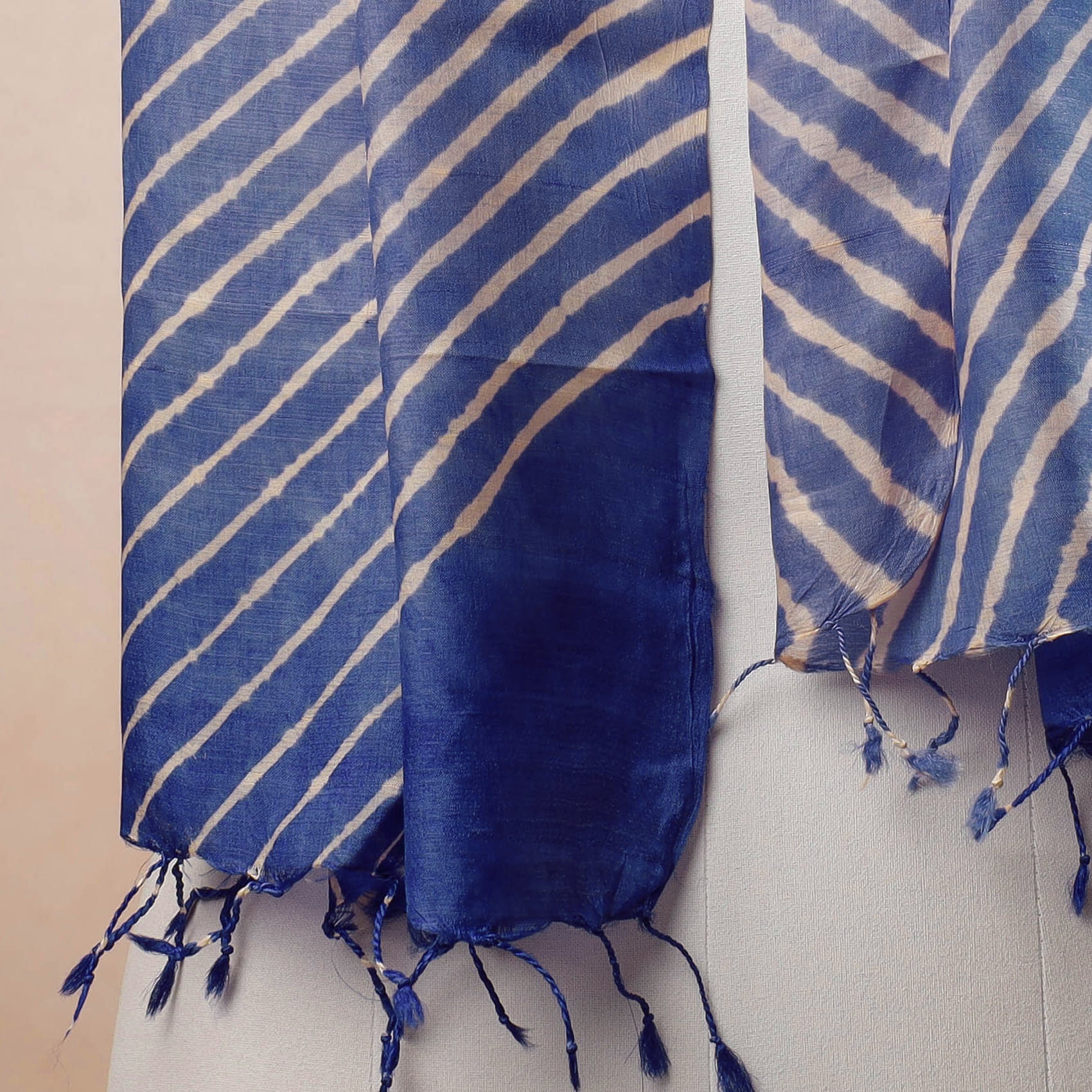 Fine quality original leheriya tie-dye pure tussar silk handloom stole with tassels. Azo free dye have been used to make this stole. The wavy patterns on this stole has been dyed using leheriya tie & dye technique through traditional process by master artisan family of Badshah Miyan from the state of Rajasthan. Tussar silk is known for its unique texture, sheen of silk, and feel of cotton.