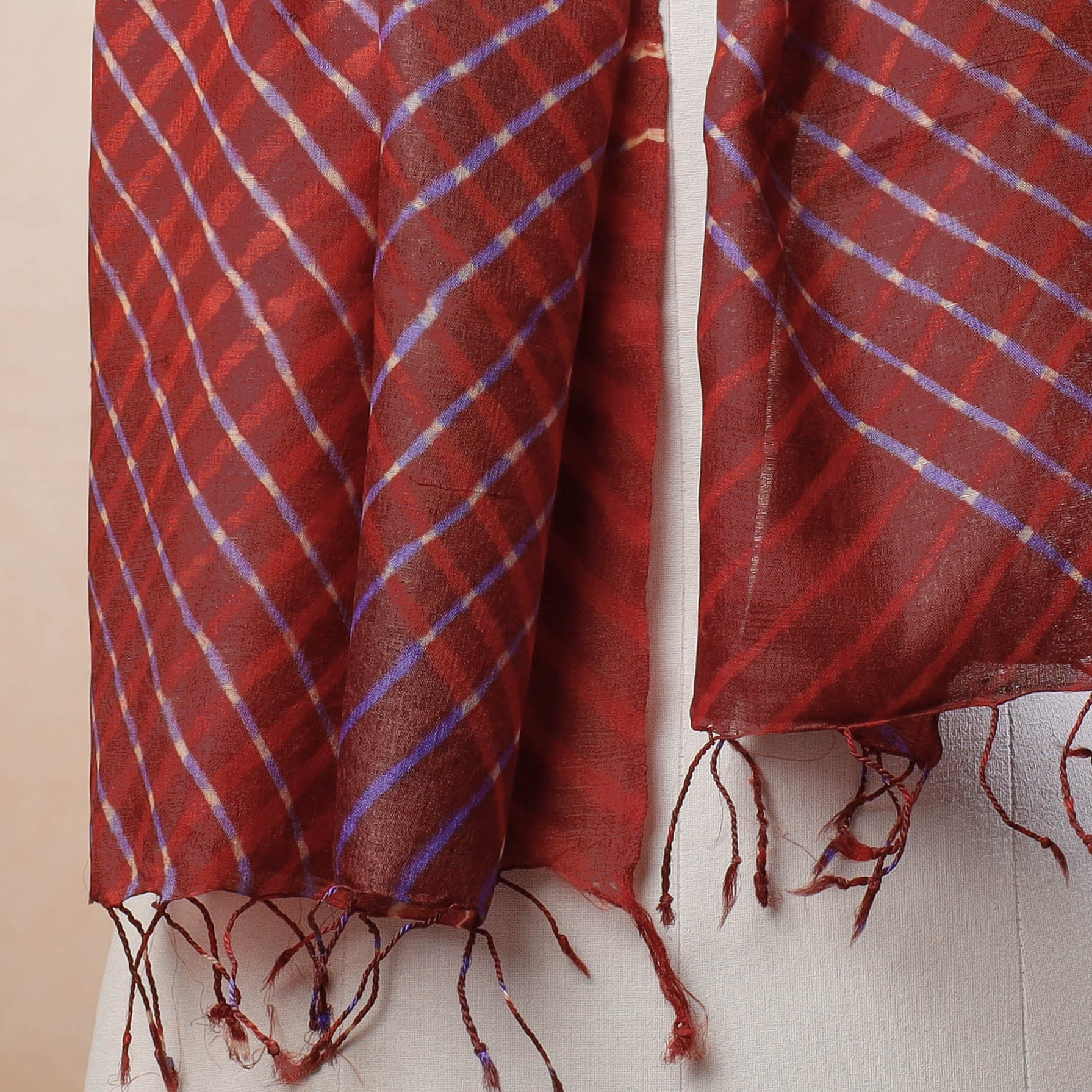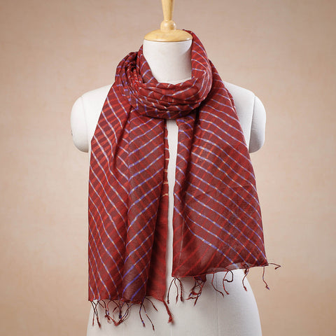 Fine quality original leheriya tie-dye mothra pure tussar silk handloom stole with tassels. Azo free dye have been used to make this stole. The wavy patterns on this stole has been dyed using leheriya tie & dye technique through traditional process by master artisan family of Badshah Miyan from the state of Rajasthan. Tussar silk is known for its unique texture, sheen of silk, and feel of cotton.