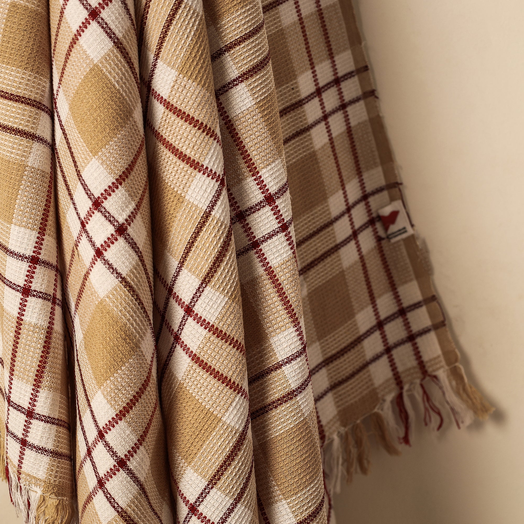 Fine quality handloom cotton honeycomb bath towel from Dehradun. The handloom experience (soft, comfortable and durable) is due to the human handling of the yarn in the weaving process. As a result, yarn and the fabric are much less stressed and damaged. Hand woven cotton is known for its breathability as compared to mill made cotton.