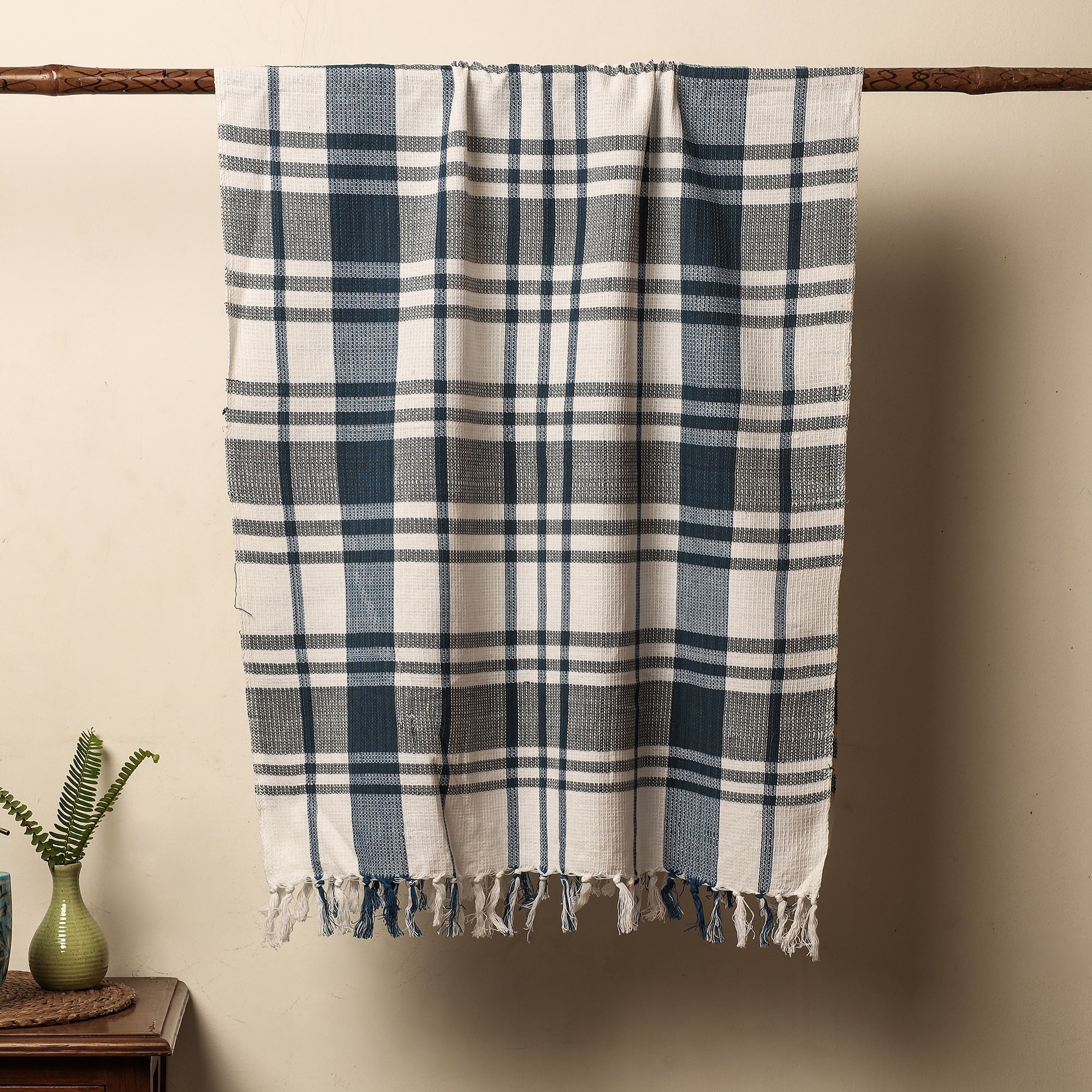 Fine quality handloom cotton honeycomb bath towel from Dehradun. The handloom experience (soft, comfortable and durable) is due to the human handling of the yarn in the weaving process. As a result, yarn and the fabric are much less stressed and damaged. Hand woven cotton is known for its breathability as compared to mill made cotton.