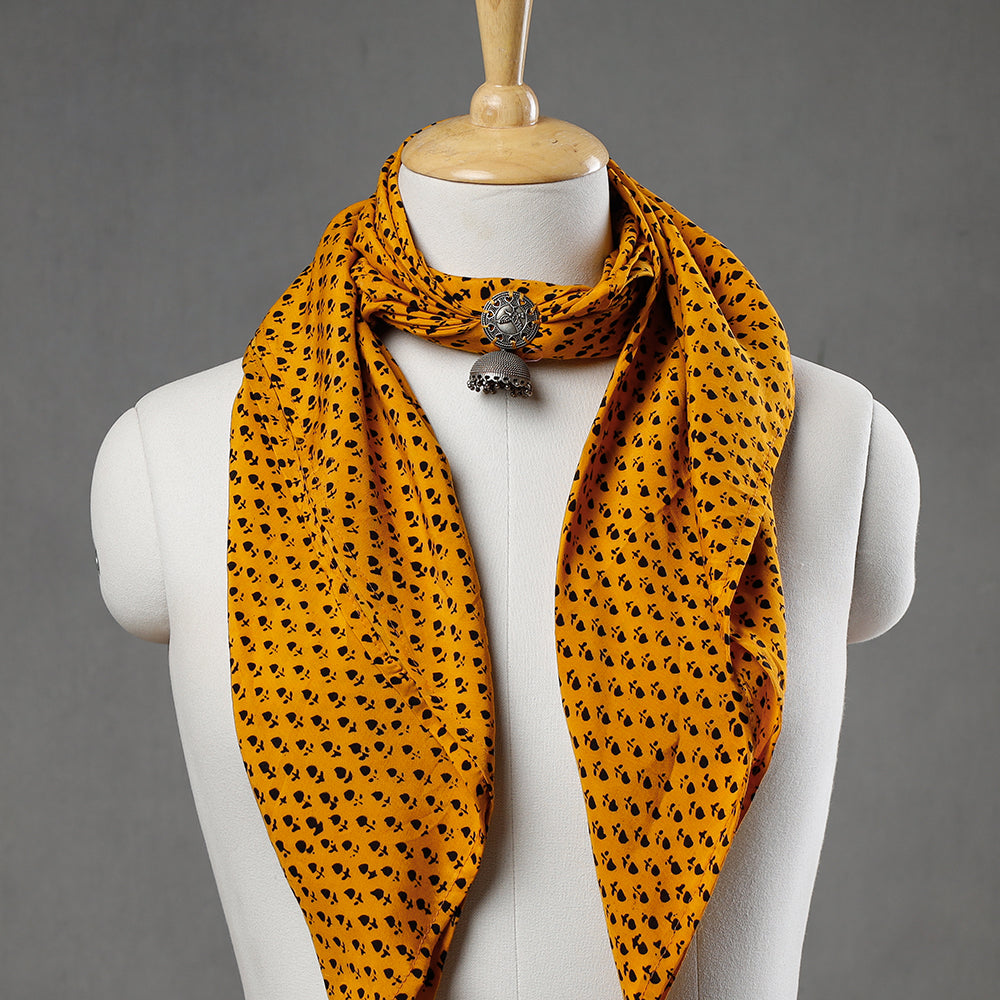 | Material | Bagh block printed modal silk scarf/stole with necklace pendant. The blocks have been printed using natural dyes. This scarf/stole is super soft and comfortable. Wear scarves of different lengths, as chokers or as long pendants, to create different looks. Modal silk is a soft and highly lustrous fabric, achieved through interlacing modal fibers and silk yarns. it has opulence of silk and the comfort of cotton modal is a fine and soft textured weave. |