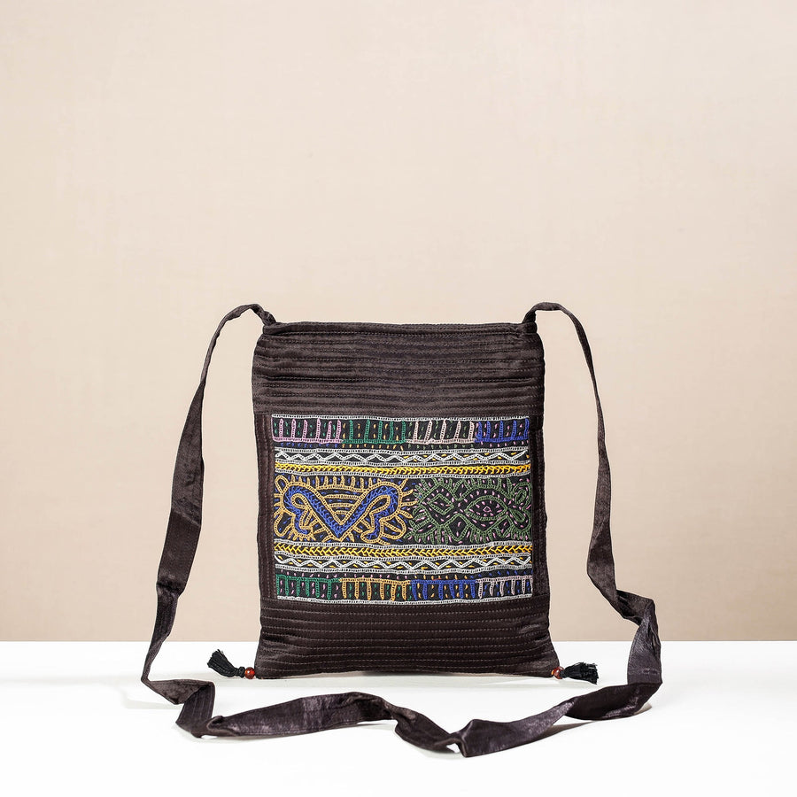 Fine quality brown kutch rabari hand embroidered mashru silk sling bag. This bag is crafted from mashru silk fabric with intricate and beautiful rabari hand-embroidered mirror work done by craftswomen in the Kutch region of Gujarat. It has one zipper pocket inside and one zipper pocket outside. Ample space to keep most of your essentials.