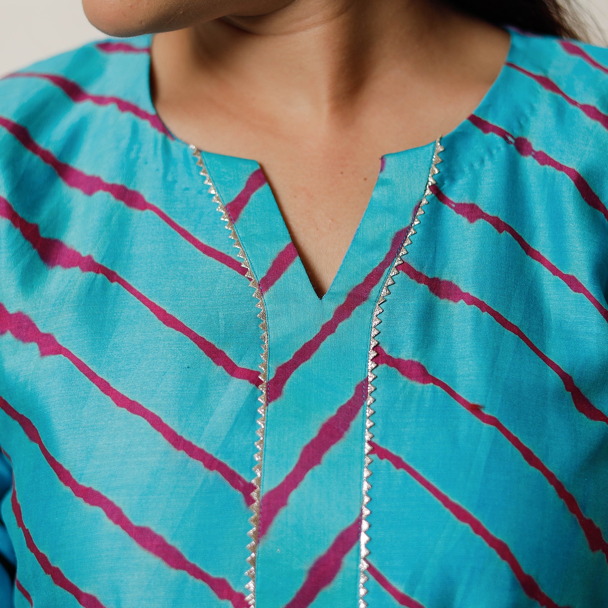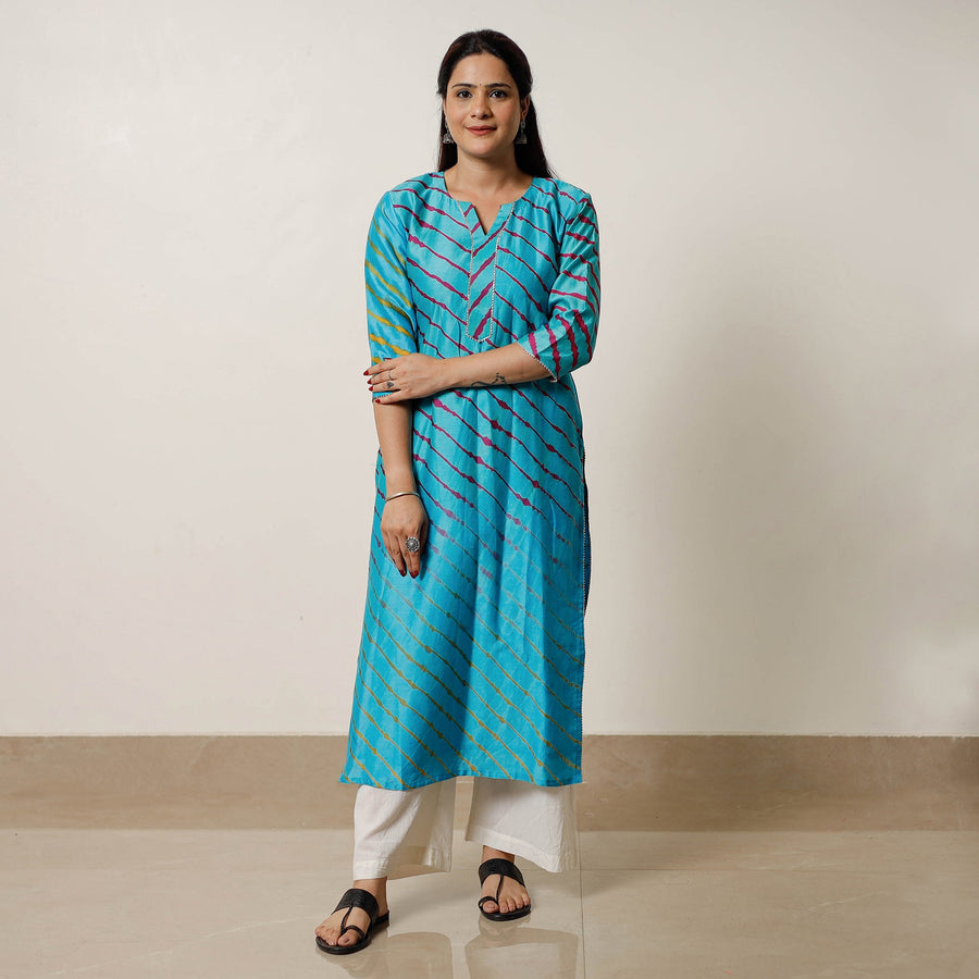 Look and feel beautiful in this uniquely designed leheriya tie-dye gota patti chanderi silk long kurta with side pocket. This silk kurta makes you comfortable with ease all day long. This kurta is perfect for your daily outing and for a special occasion. Chanderi silks are known for its gossamer looks and amazing feel.