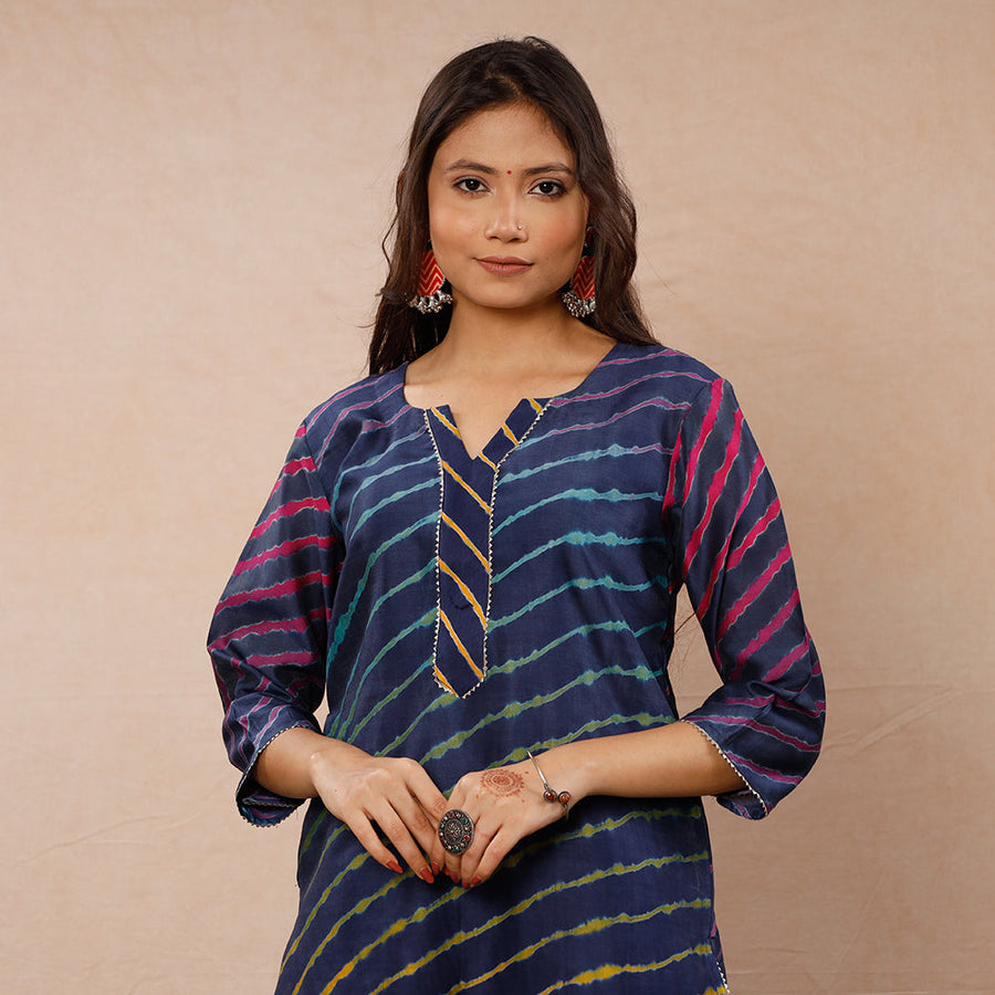 Look and feel beautiful in this uniquely designed leheriya tie-dye gota patti chanderi silk long Kurta with side pocket. This silk Kurta makes you comfortable with ease all day long. This Kurta is perfect for your daily outing and for a special occasion. Chanderi silks are known for its gossamer looks and amazing feel.