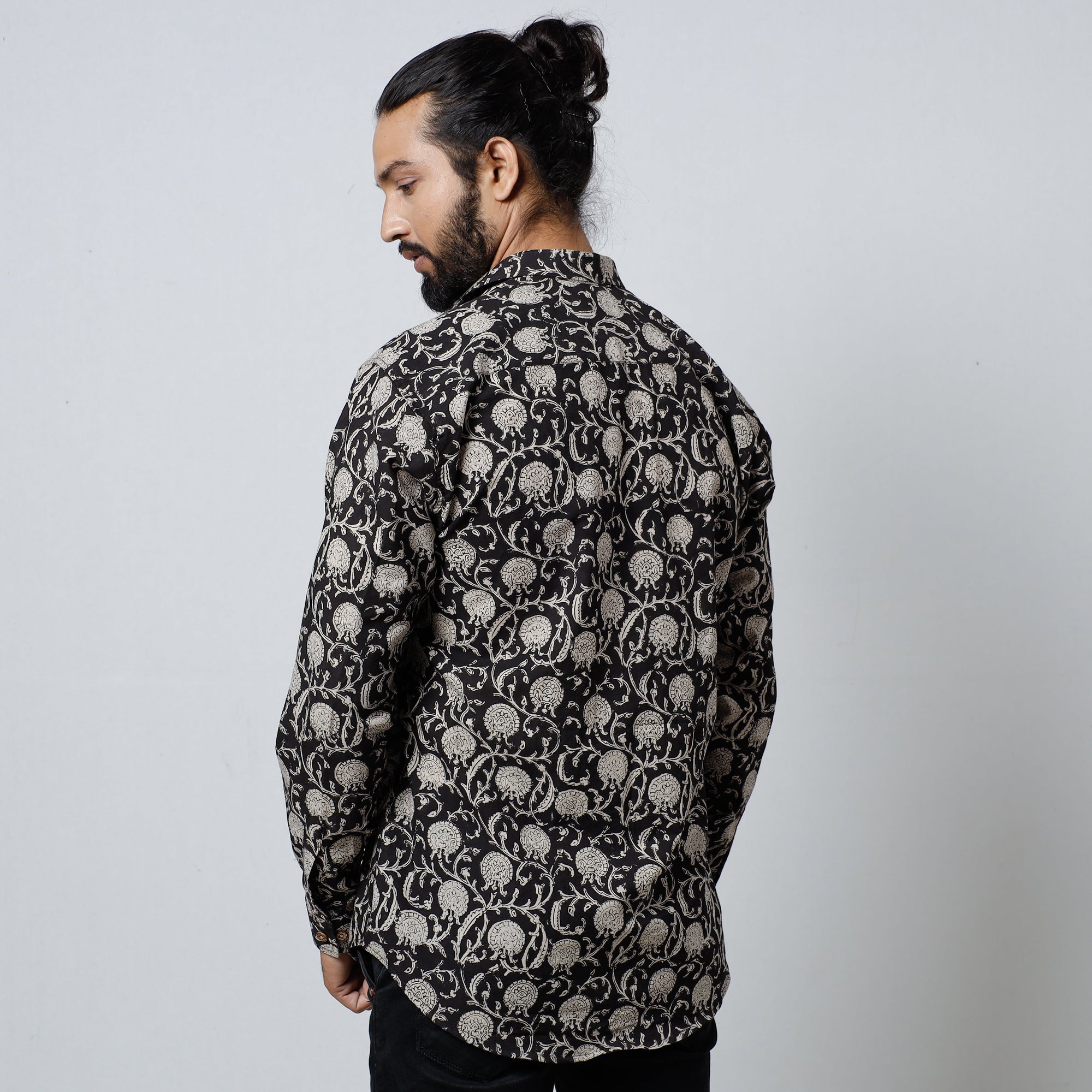 Fine quality black bagru block printed cotton men's full sleeve shirt. This shirt is made using natural dyes through a traditional mud resist process using hand carved wooden blocks practised in Bagru, Rajasthan.