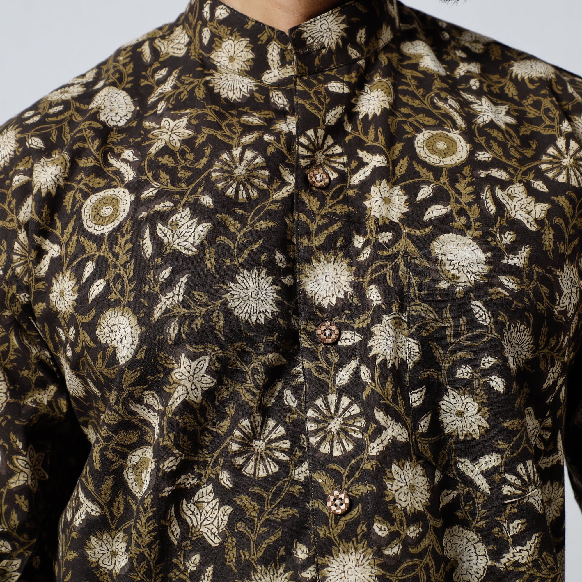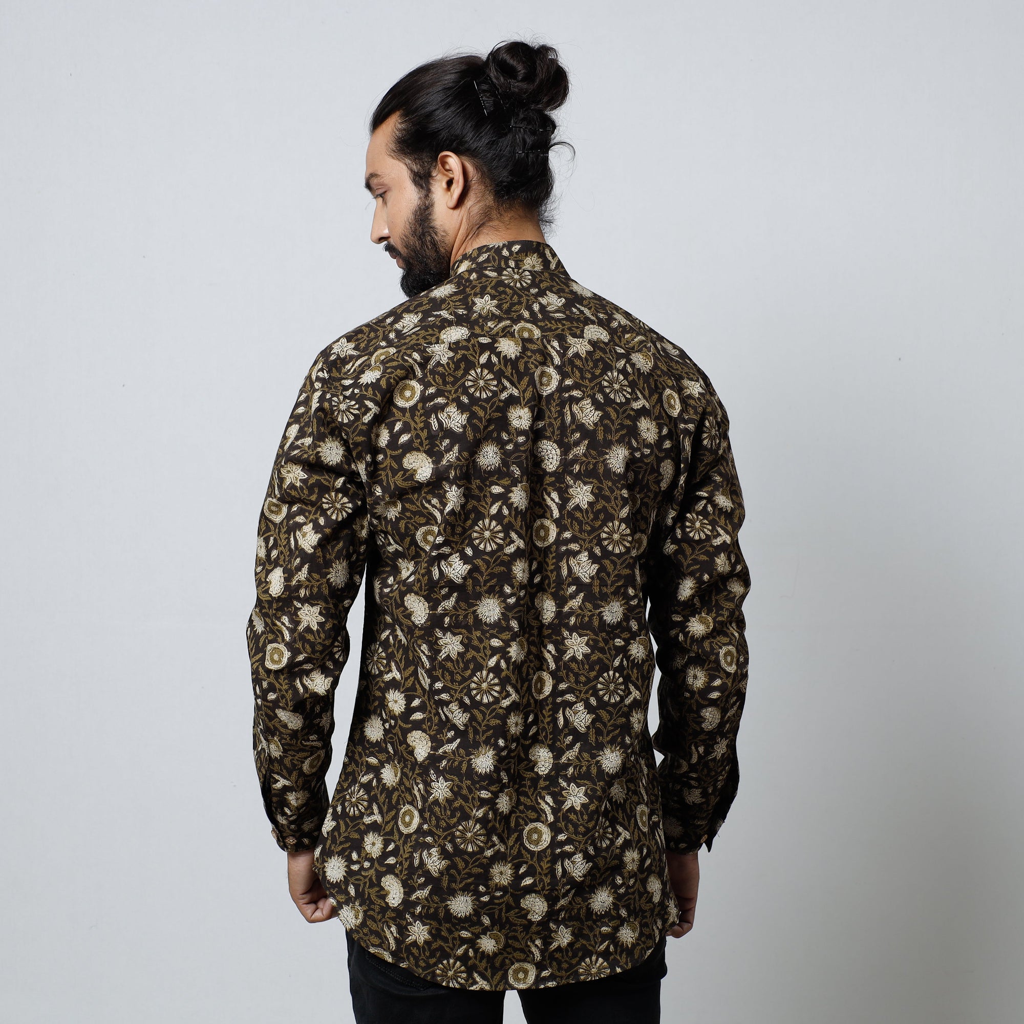 Fine quality black bagru block printed cotton men's full sleeve shirt. This shirt is made using natural dyes through a traditional mud resist process using hand carved wooden blocks practised in Bagru, Rajasthan.