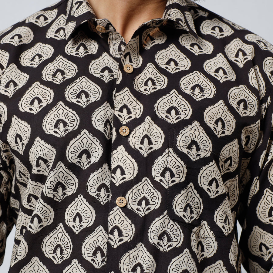 Fine quality black bagru block printed cotton men's full sleeve shirt. This shirt is made using natural dyes through a traditional mud resist process using hand carved wooden blocks practised in Bagru, Rajasthan.