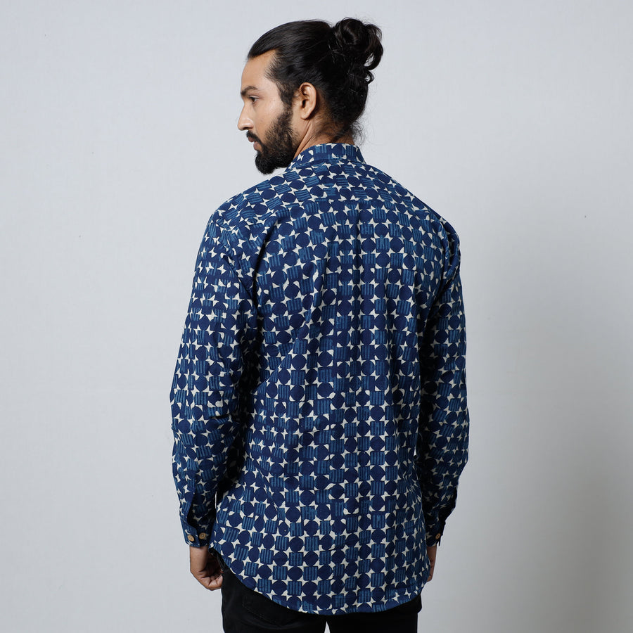 Fine quality bagru block printed cotton men's full sleeve shirt. This shirt is made using natural dyes through a traditional mud resist process using hand carved wooden blocks practised in Bagru, Rajasthan.