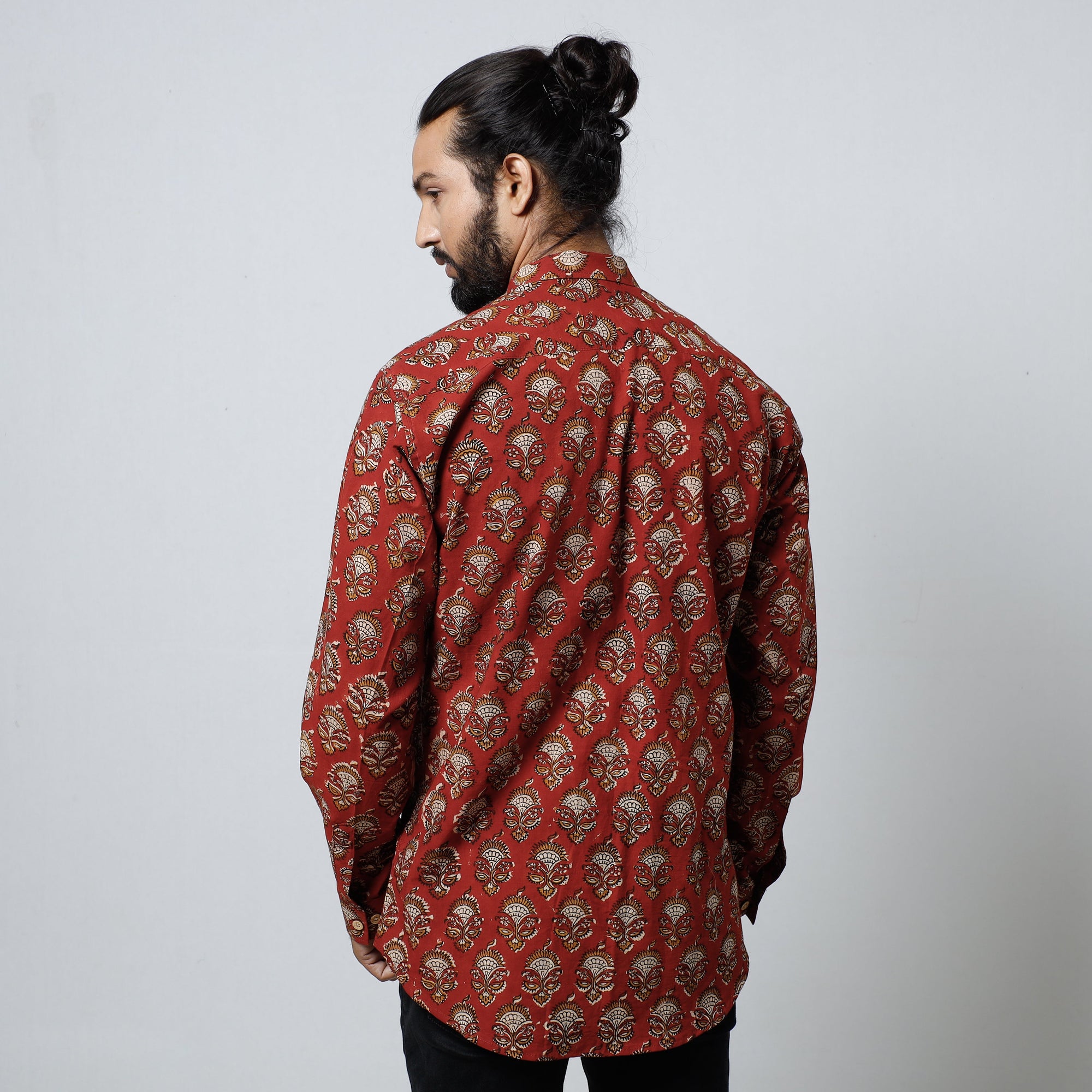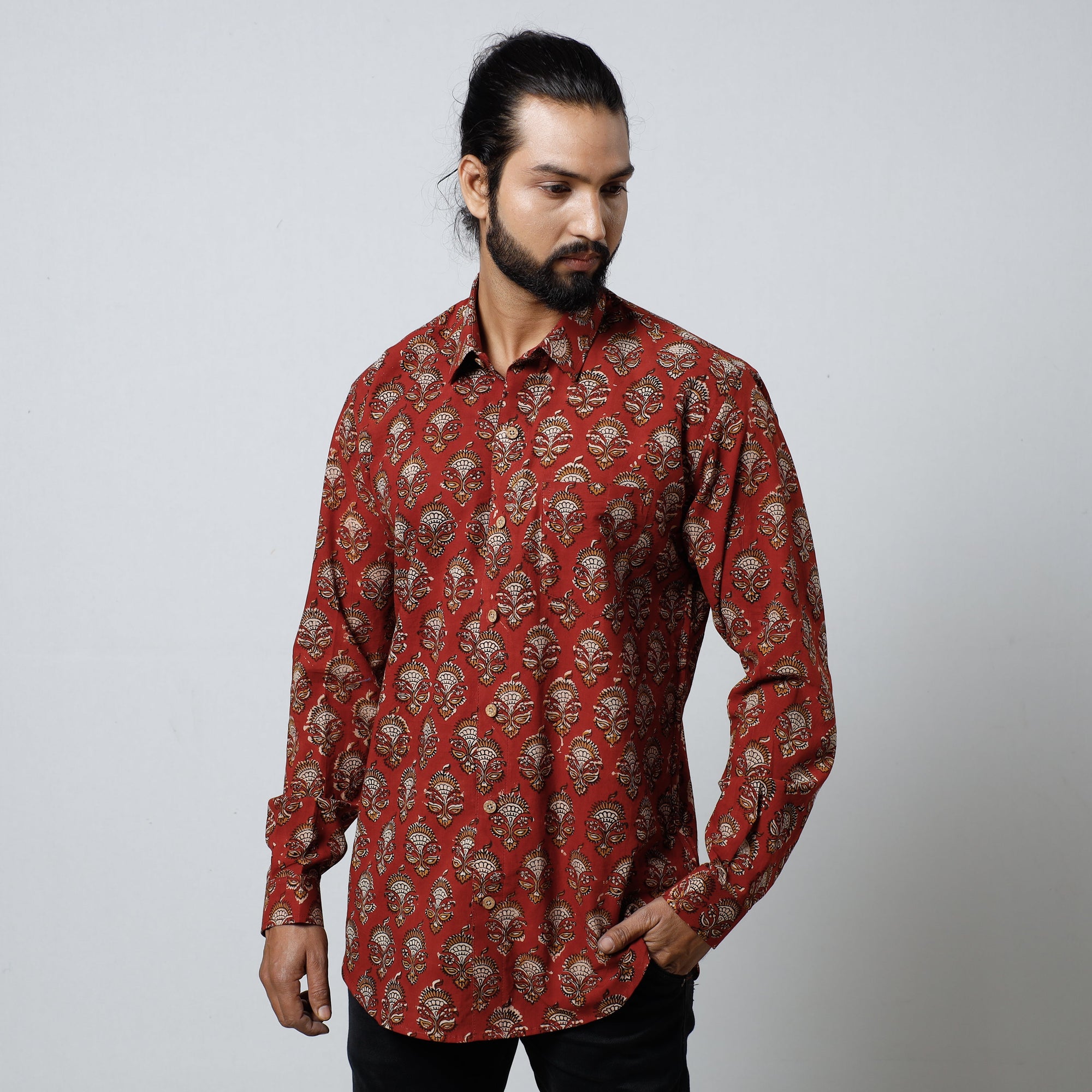 Fine quality red bagru block printed cotton men's full sleeve shirt. This shirt is made using natural dyes through a traditional mud resist process using hand carved wooden blocks practised in Bagru, Rajasthan.