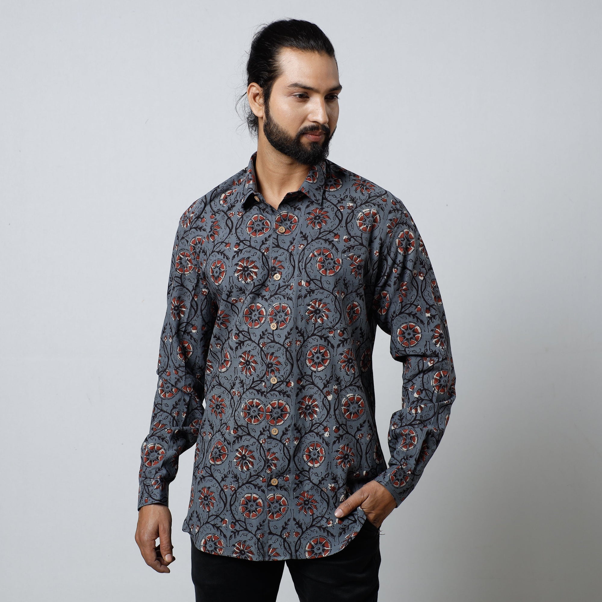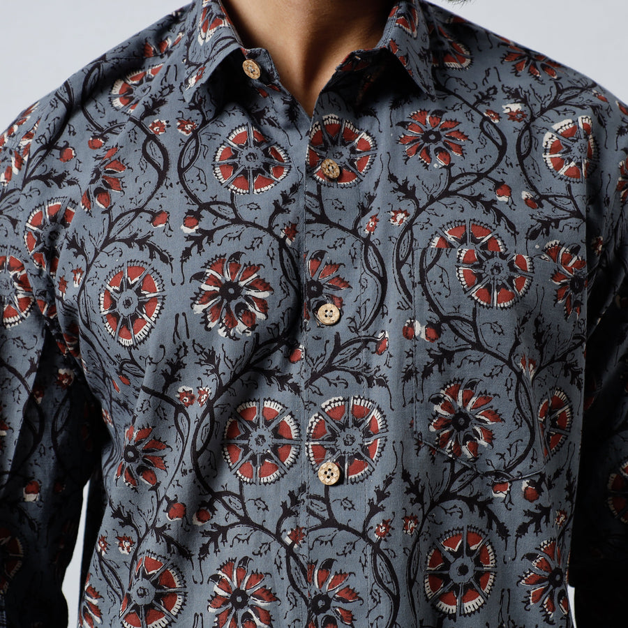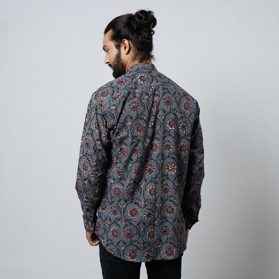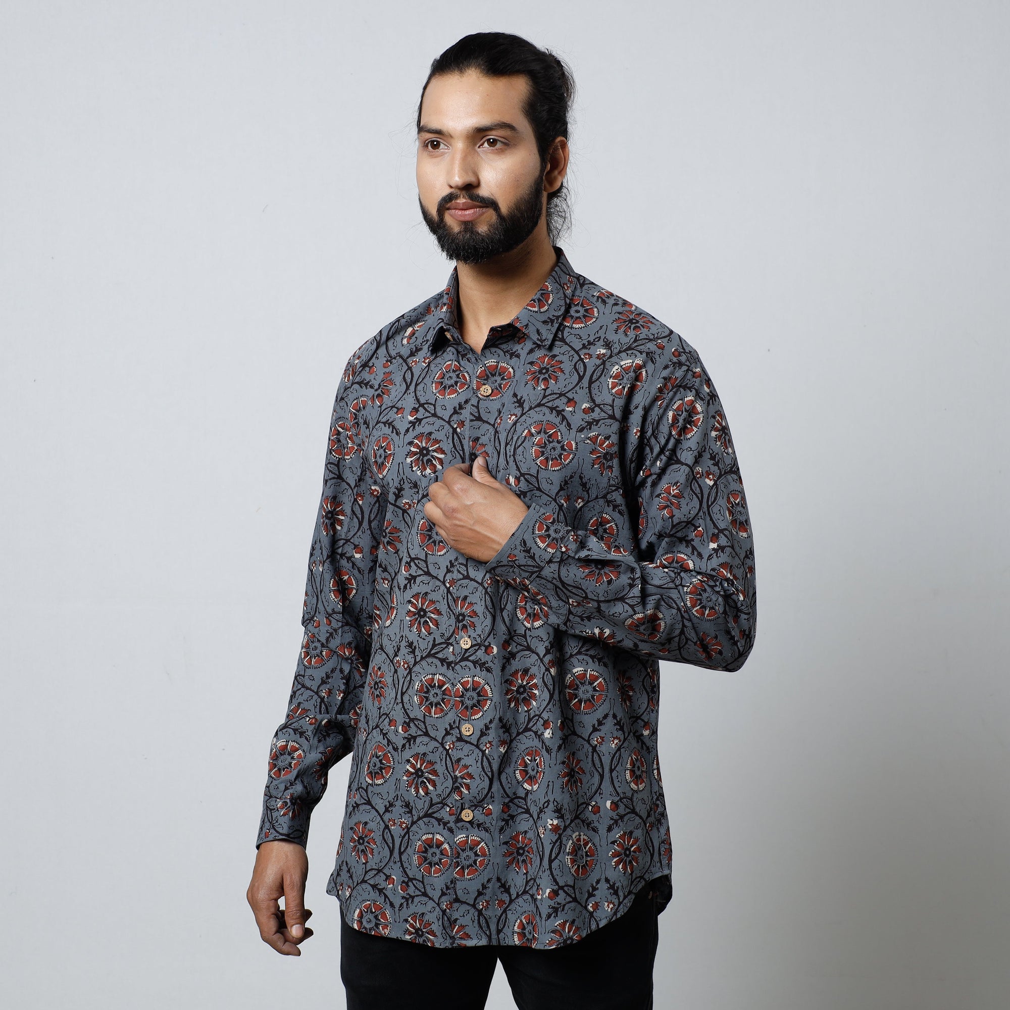 Fine quality bagru block printed cotton men's full sleeve shirt. This shirt is made using natural dyes through a traditional mud resist process using hand carved wooden blocks practised in Bagru, Rajasthan.