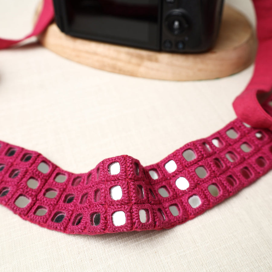 Handcrafted mirror work kutch hand embroidery cotton camera belt. The Kutch Embroidery is a handicraft and textile signature art tradition of the tribal community of kutch district in Gujarat. This embroidery with its rich designs has made a notable contribution to the Indian embroidery traditions. The embroidery, practiced normally by women is generally done on fabrics of cotton, in the form of a net using cotton or silk thread.