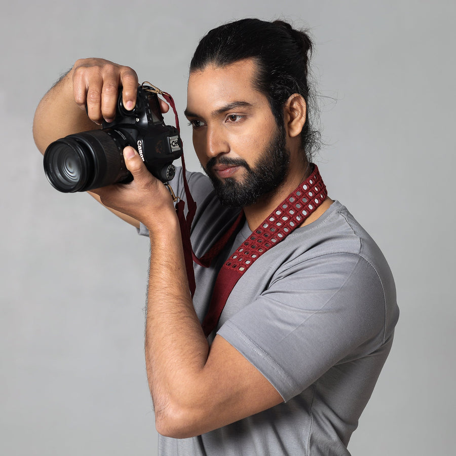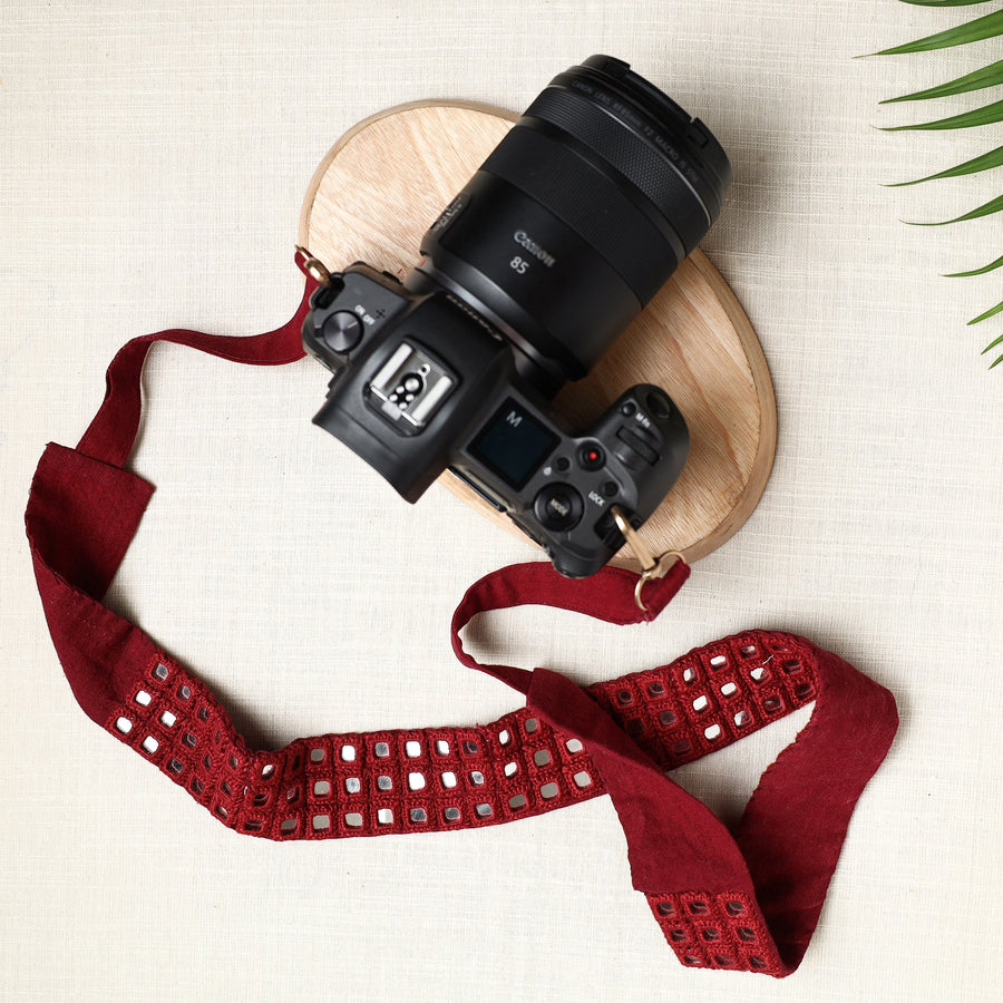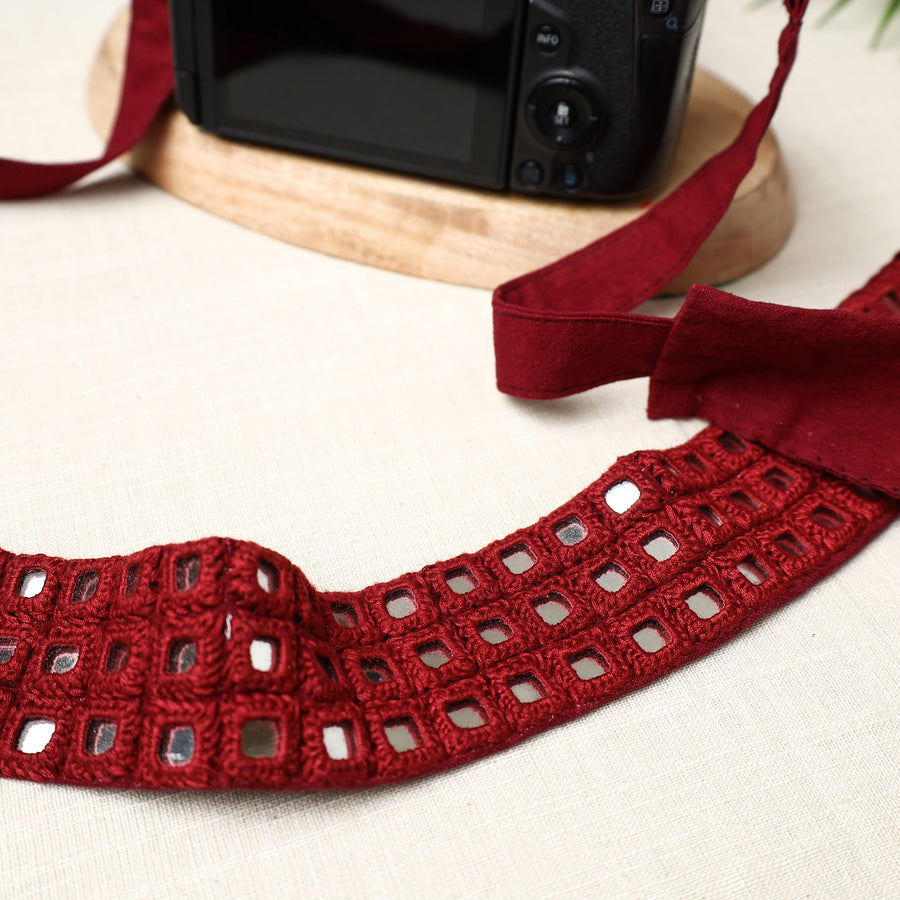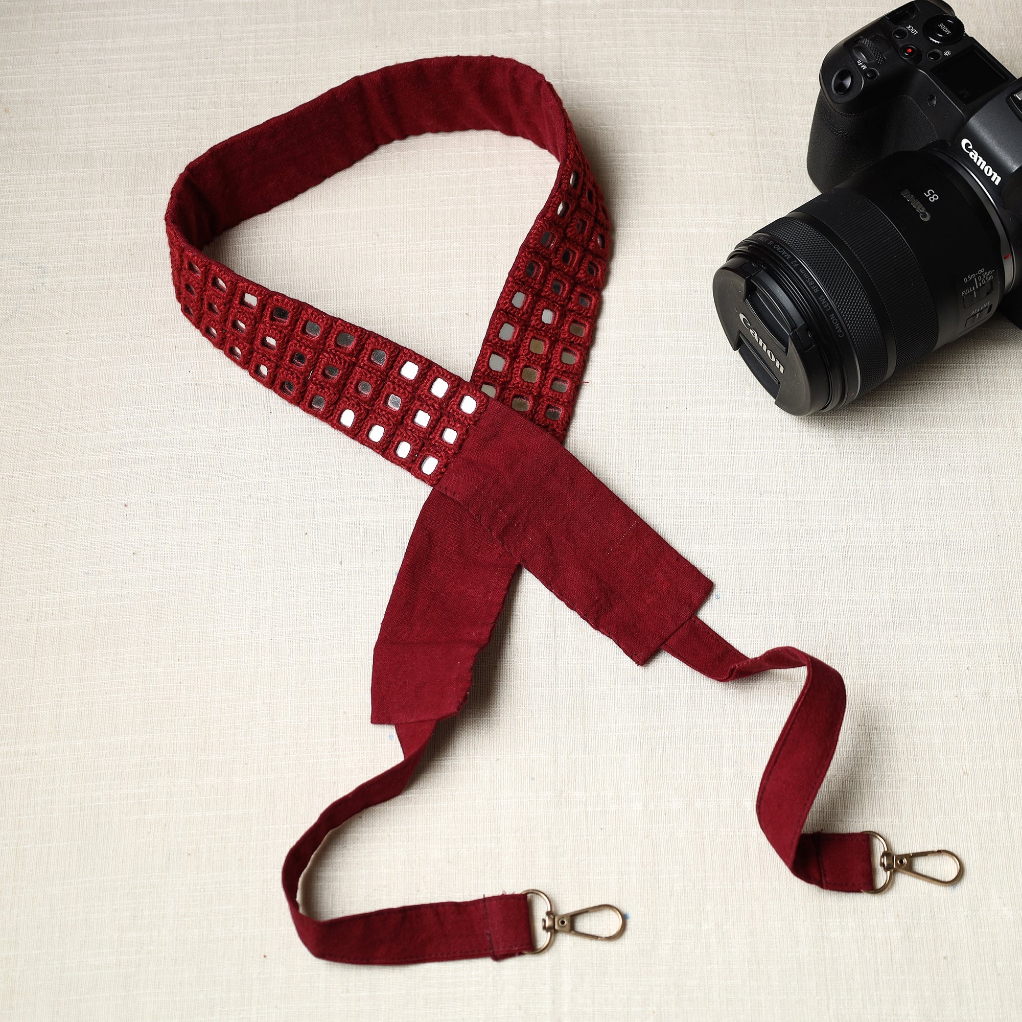 Handcrafted mirror work kutch hand embroidery cotton camera belt. The Kutch Embroidery is a handicraft and textile signature art tradition of the tribal community of kutch district in Gujarat. This embroidery with its rich designs has made a notable contribution to the Indian embroidery traditions. The embroidery, practiced normally by women is generally done on fabrics of cotton, in the form of a net using cotton or silk thread.
