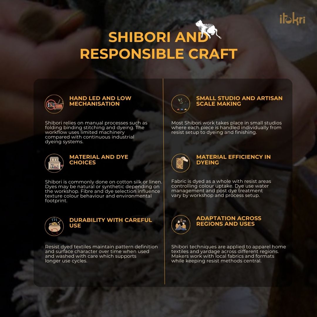 Shibori is a very well-known dyeing craft technique that involves folding, twisting, or bunching cloth and binding it, and after that dyeing it in indigo and other colors. It is practiced in Delhi, Gujarat, and Rajasthan.