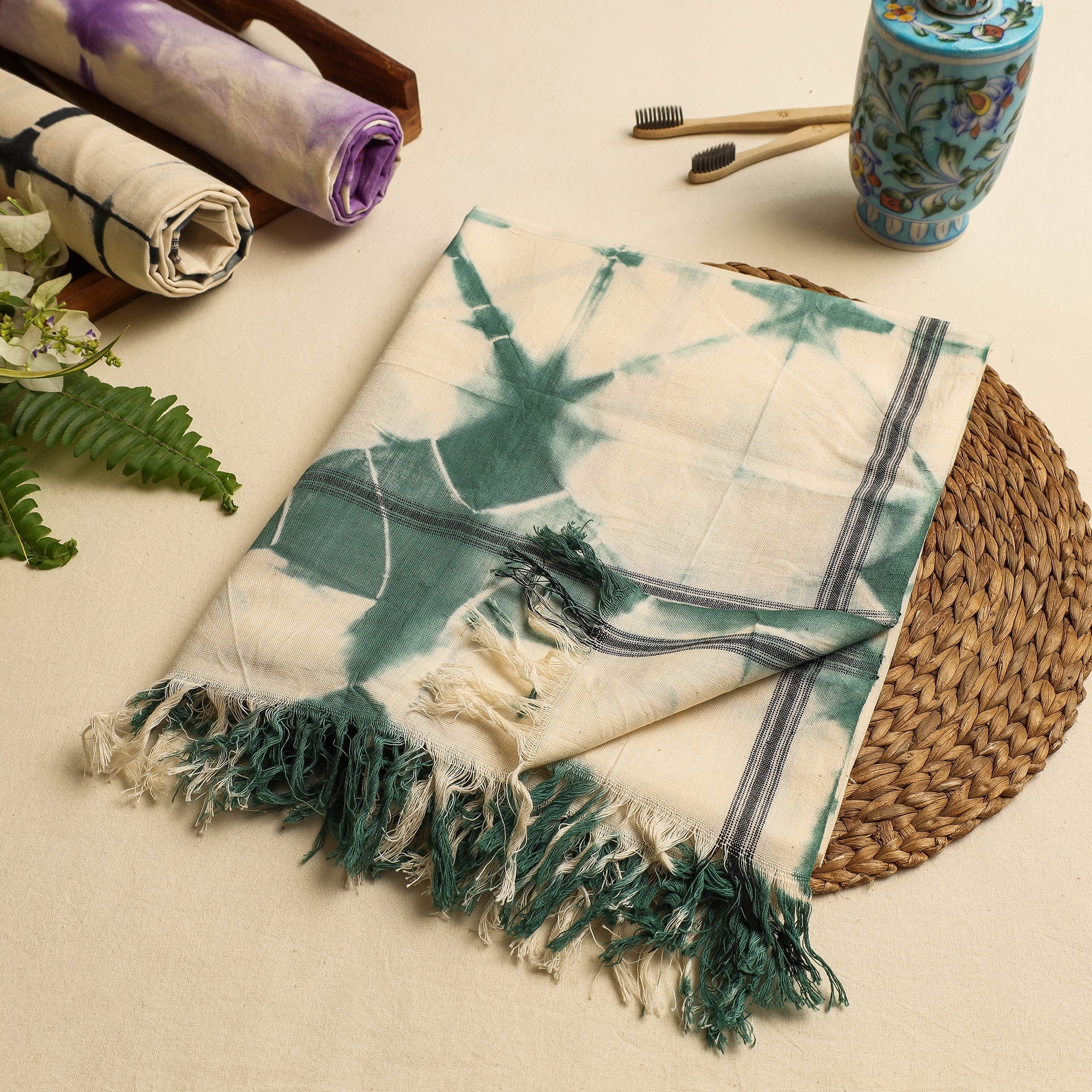 Fine quality shibori tie-dye pure cotton towel from Rajasthan. This towel is hand dyed using shibori tie and dye technique in which the fabric is tied using clamp or stitches in the required design and the pattern is dyed.Bleed free VAT dyes used.