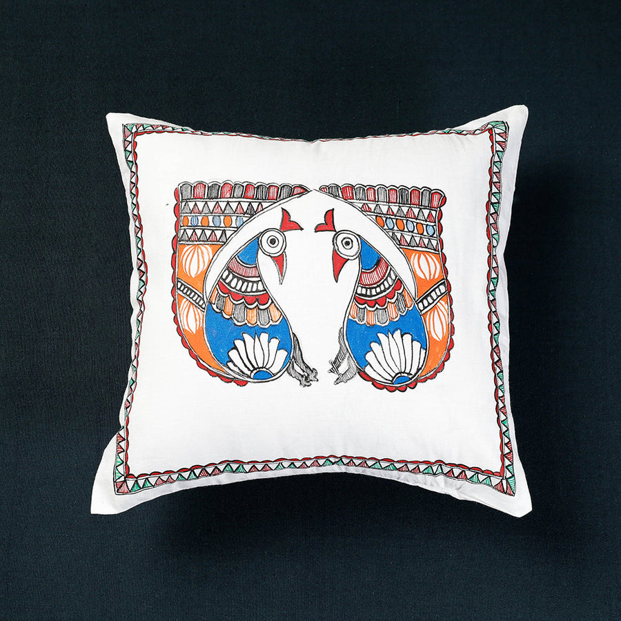 White - Madhubani Handpainted Cotton Cushion Cover (16 x 16 in)