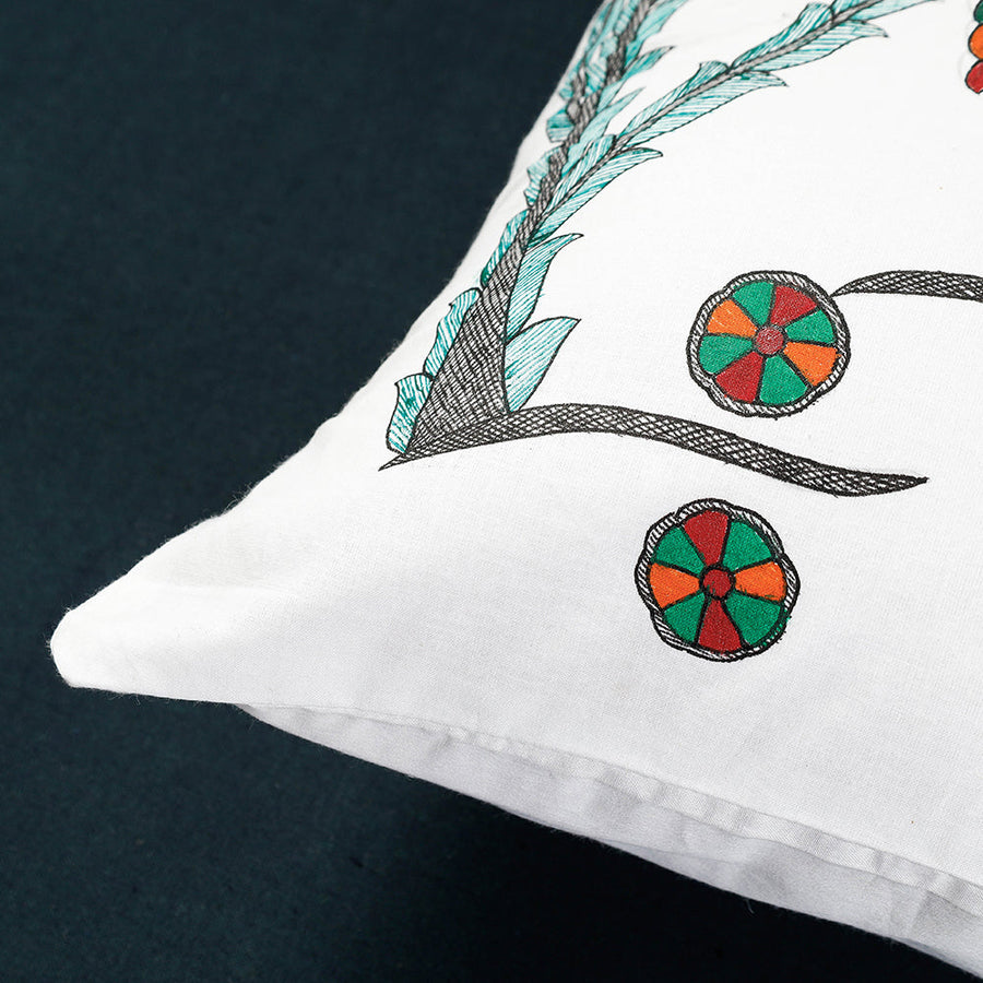 White - Madhubani Handpainted Cotton Cushion Cover (16 x 16 in)