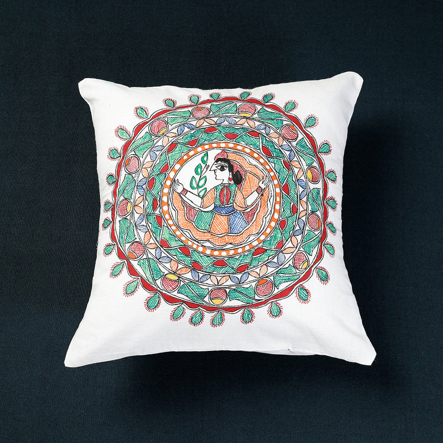 Fine quality white madhubani handpainted cushion cover made from cotton fabric, using acrylic colours with representations of traditional Mithila art form by Bihar's Ruchi Jha.