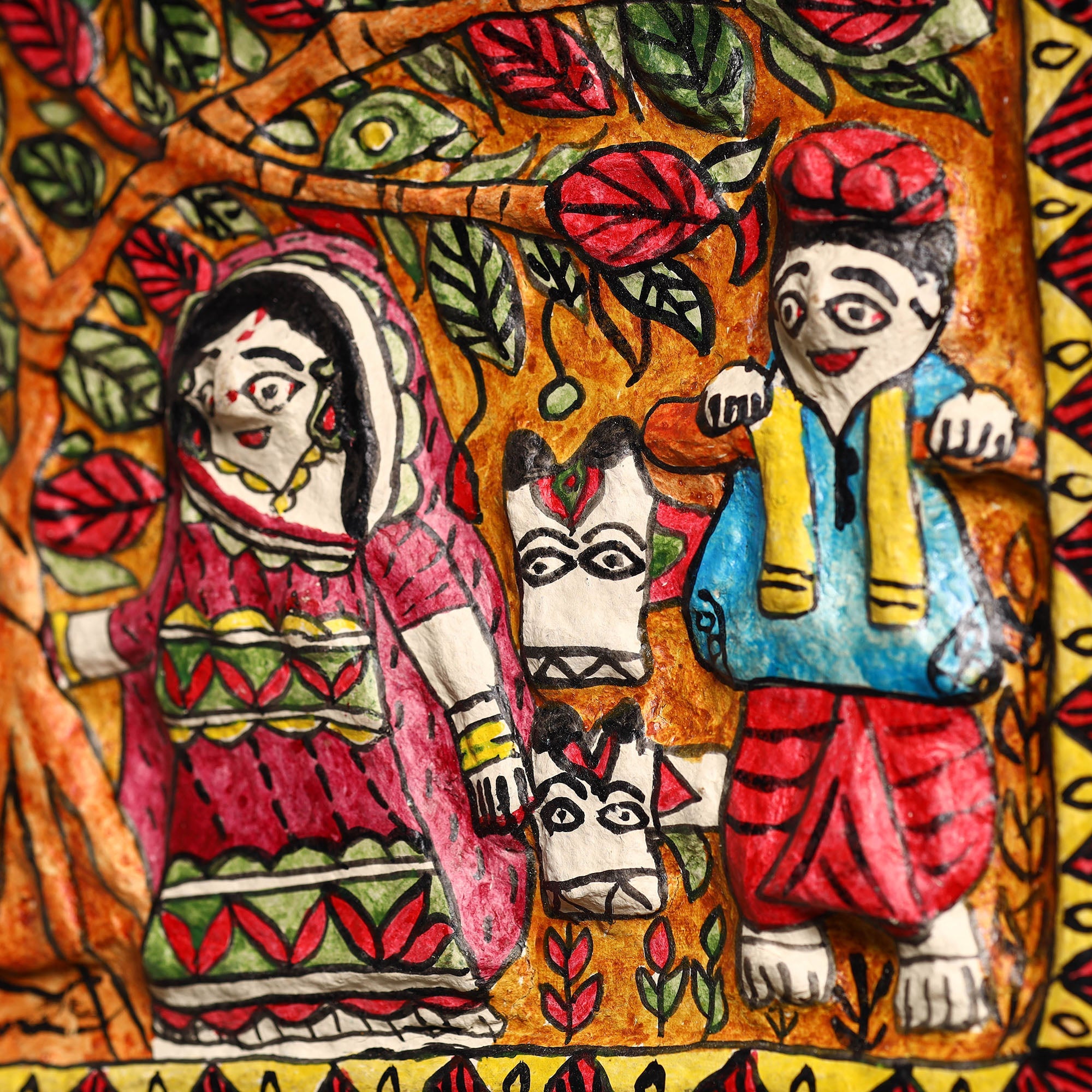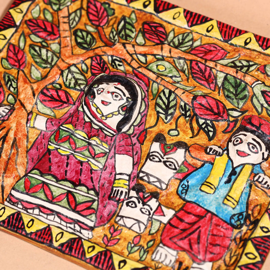 Handpainted madhubani motifs with natural colors on paper mache decorative item by master artisan Kamini Kaushal from Bihar.