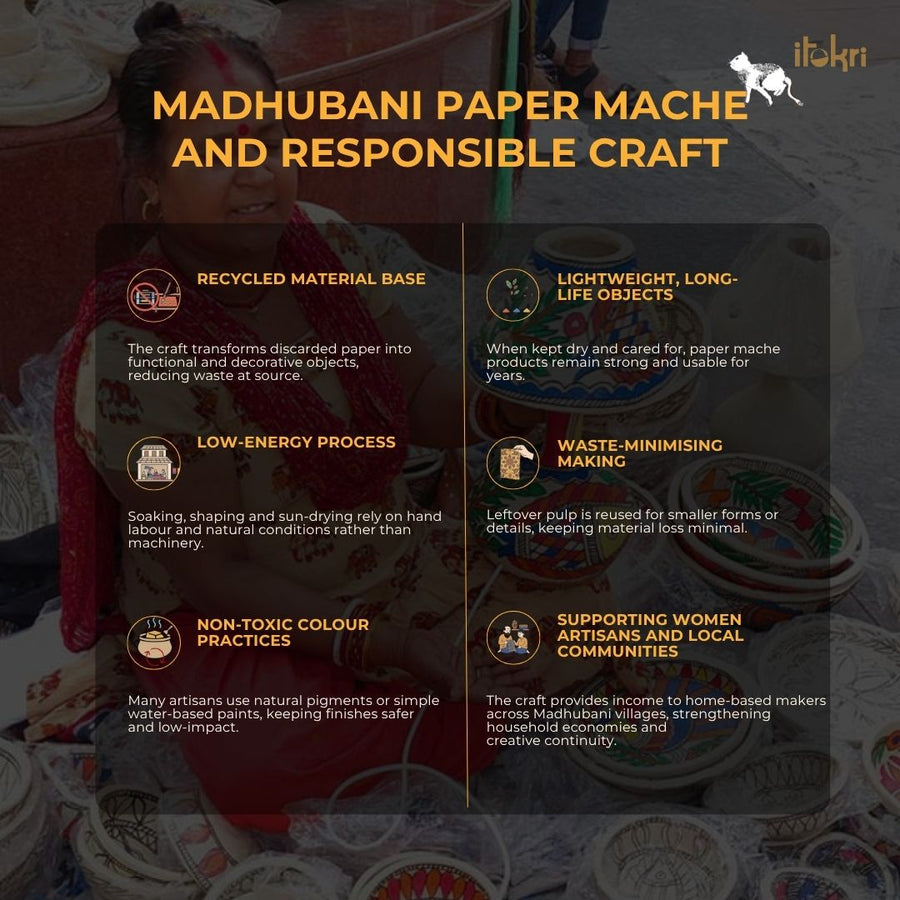 | Material | Handpainted Madhubani motifs with natural colors on paper mache decorative item by master artisan Kamini Kaushal from Bihar. Raw Material used *Newspaper or any other waste paper- the basic raw material for this craft which is used to prepare paper pulp. Methi powder- it is used for fragrance and methi powder helps in keeping it safe from moths and other insects. Adhesive- it is mixed in paper pulp for sticking it. Multani Mitti- to provide strength to the product & it gives a better finish. Madhubani - Mithila Painting (also called Madhubani art or Mithila painting) is practiced in the Mithila region of India.