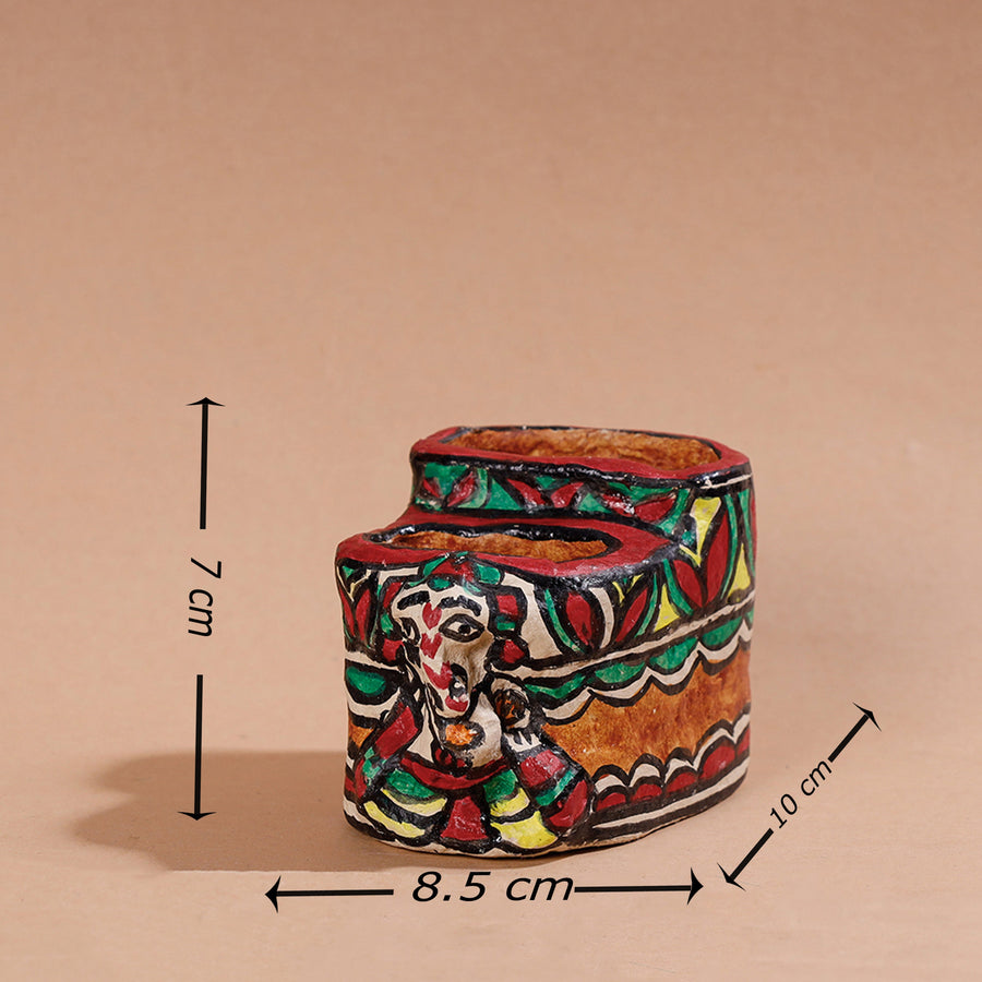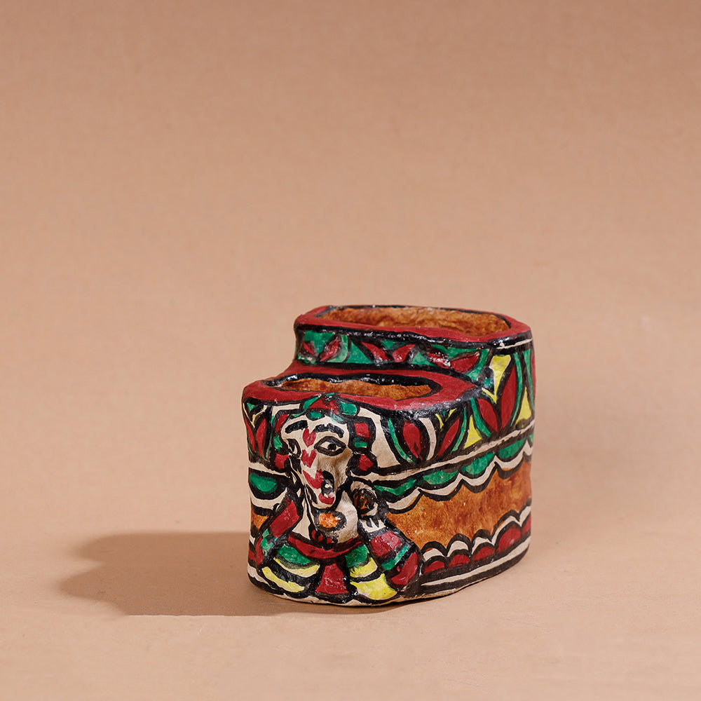 Handpainted Madhubani motifs with natural colors on paper mache decorative item by master artisan Kamini Kaushal from Bihar.