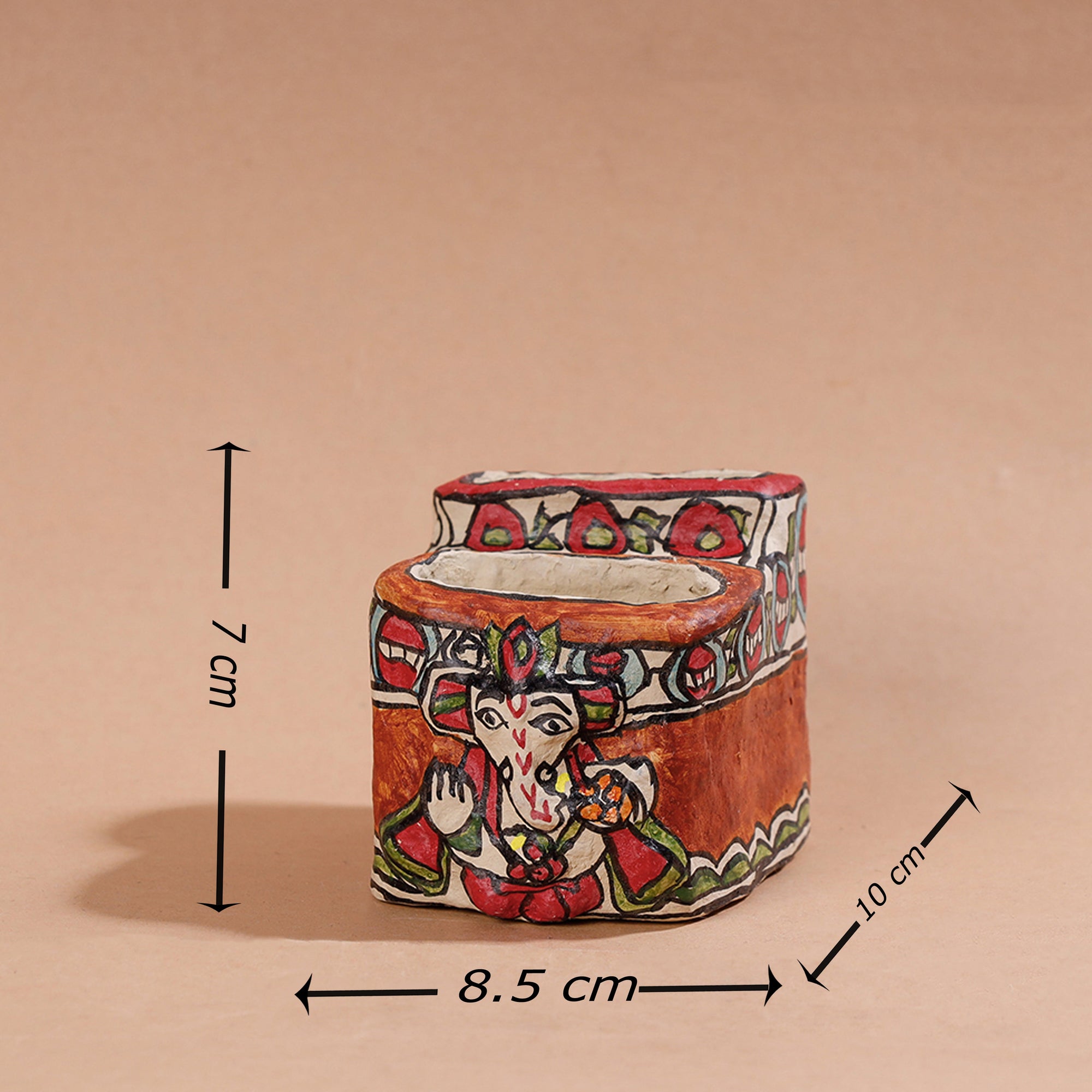 Handpainted Madhubani motifs with natural colors on paper mache decorative item by master artisan Kamini Kaushal from Bihar.