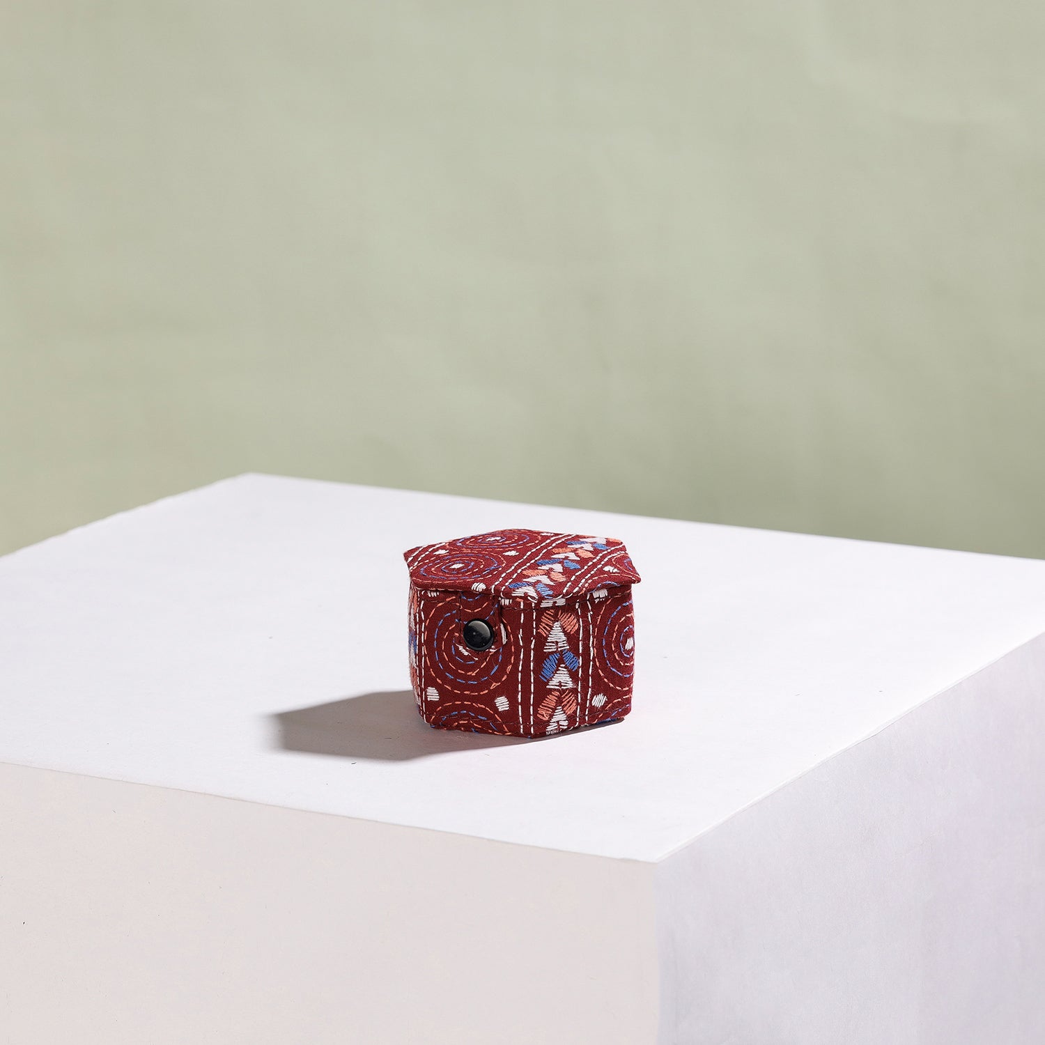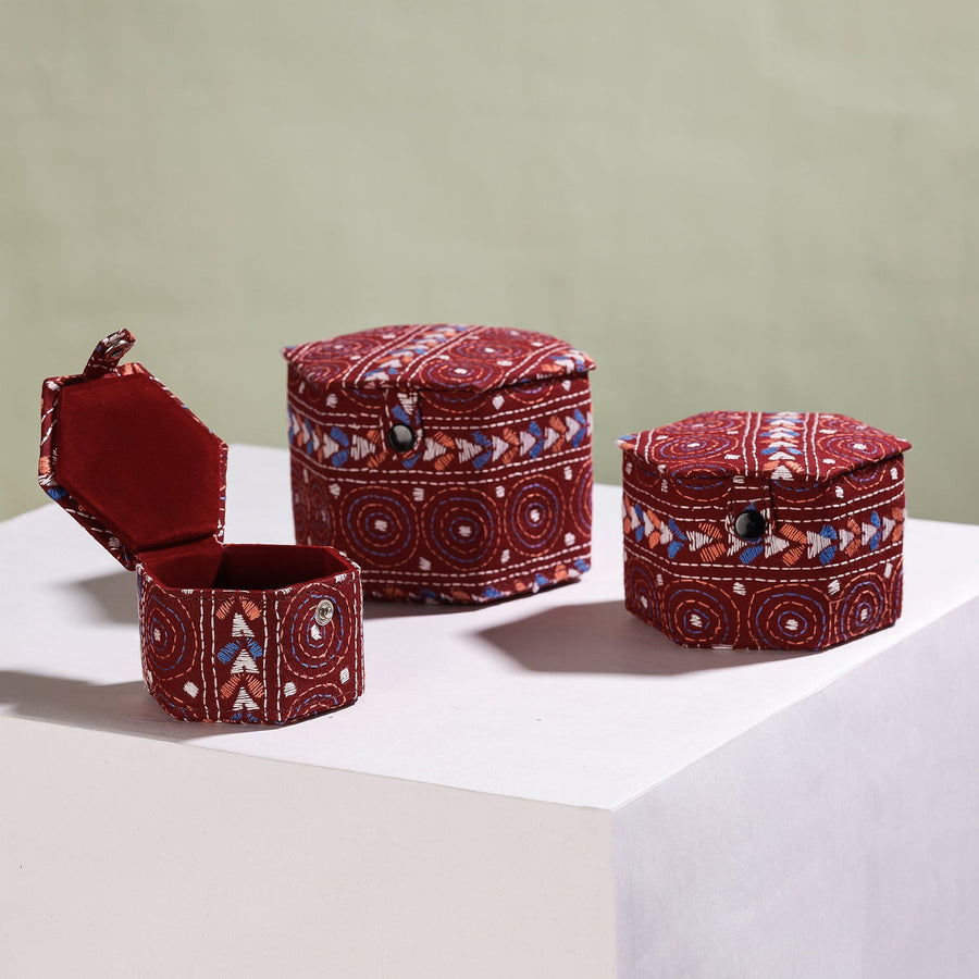 Fine quality, maroon handcrafted Kantha-work jewellery storage boxes from West Bengal. Made from hardboard, the box is lined with kantha-work fabric outside and soft velvet inside. It has ample space to keep most of your jewellery or other small utility items, and it protects your beloved jewellery from scratch and dust.